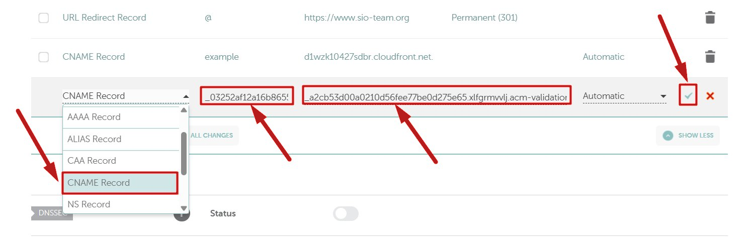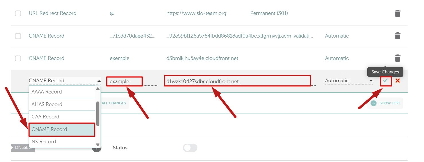 Σημείωση: εάν μια εγγραφή CNAME με το όνομα example υπάρχει ήδη, επεξεργαστείτε την τιμή της σε d1wzk10427sdbr.cloudfront.net.