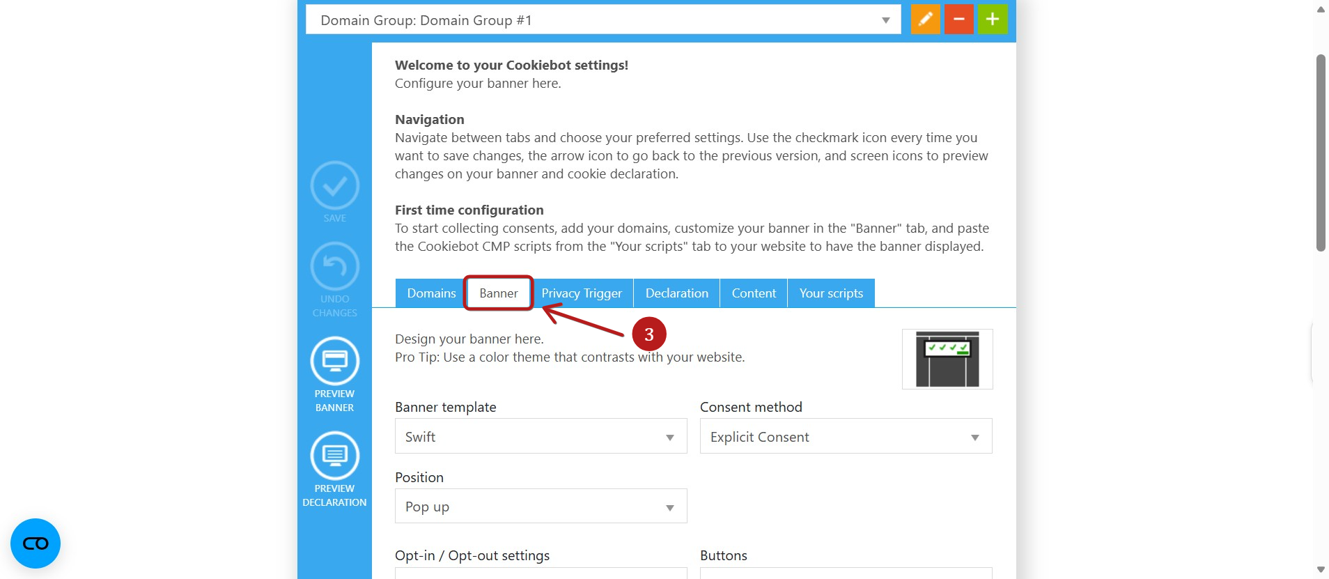 - Μεταβείτε στην καρτέλα Banner (3) για να προσαρμόσετε την εμφάνιση και τη συμπεριφορά του banner cookie σας. Εδώ, θα επιλέξετε προτιμήσεις και θα ρυθμίσετε τη Μέθοδο συγκατάθεσης για τα Cookies που θα χρησιμοποιηθεί στον ιστότοπό σας.