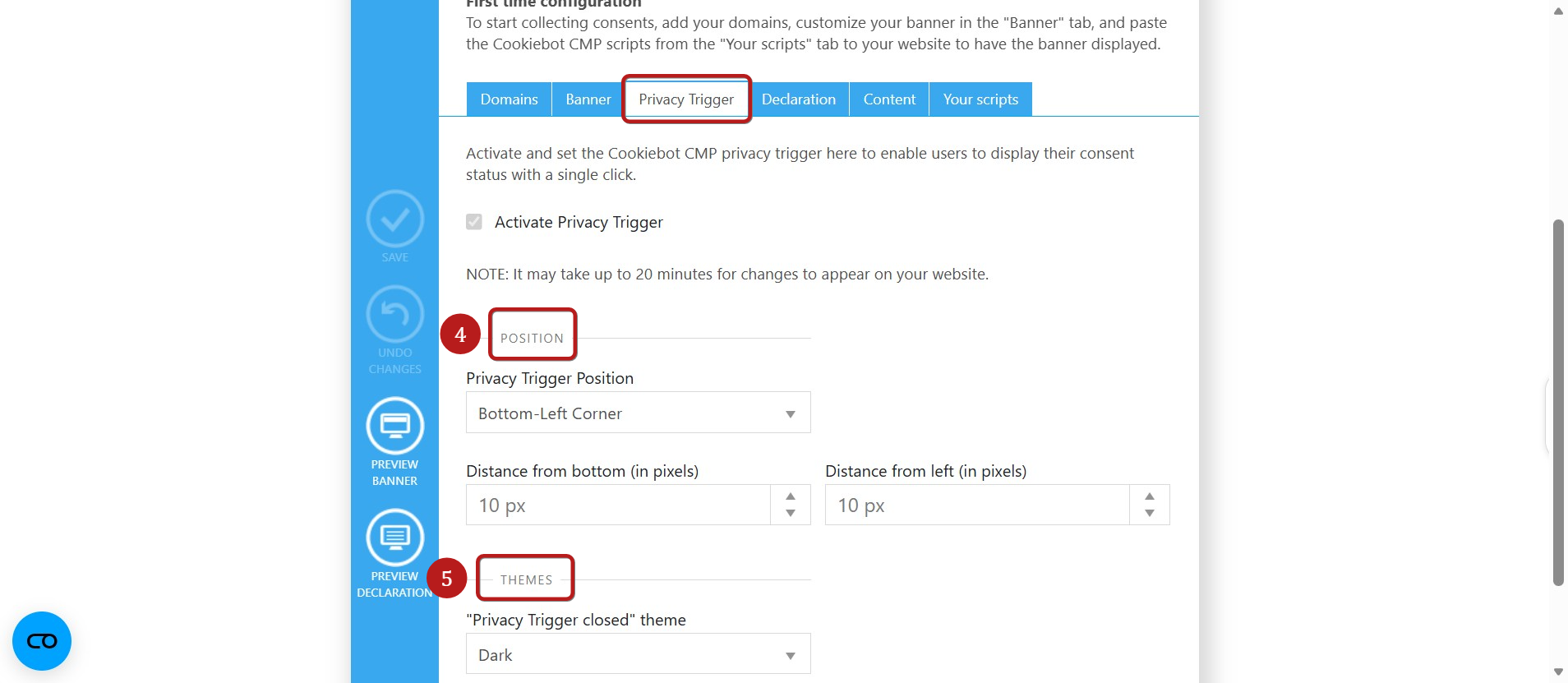 - Στην καρτέλα Privacy Trigger, μπορείτε να ενεργοποιήσετε το Privacy Trigger, το οποίο θα εμφανίζεται σε όλες τις σελίδες του ιστότοπού σας και θα επιτρέπει στους επισκέπτες να βλέπουν και να διαχειρίζονται την κατάσταση της συγκατάθεσής τους. Μπορείτε επίσης να ρυθμίσετε τη θέση (4) και το θέμα (5) του.