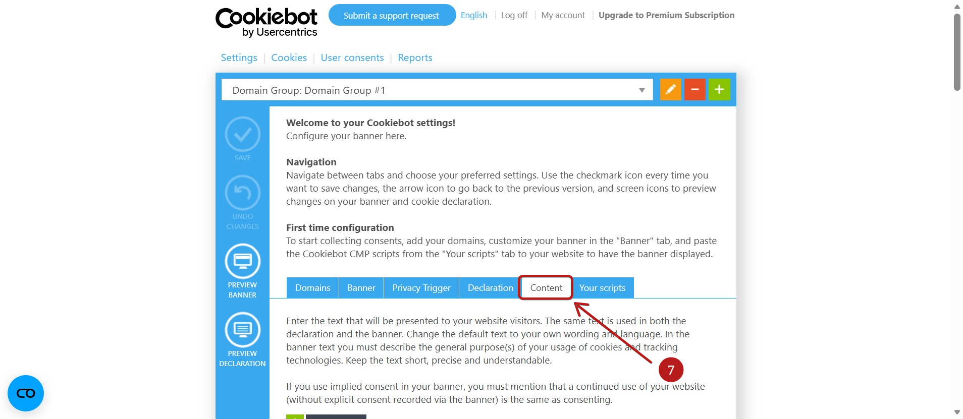 - Στην καρτέλα Content (7), μπορείτε να περιγράψετε τον γενικό σκοπό της χρήσης cookies στον ιστότοπό σας.