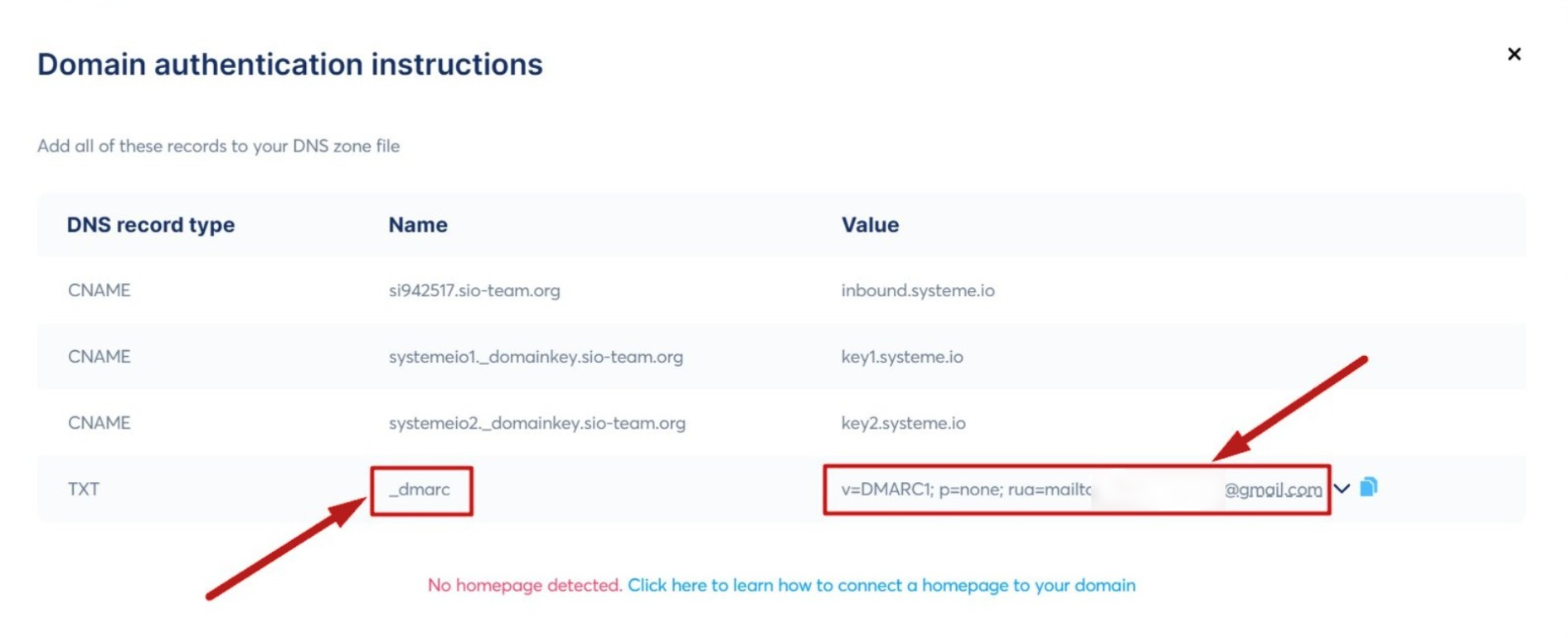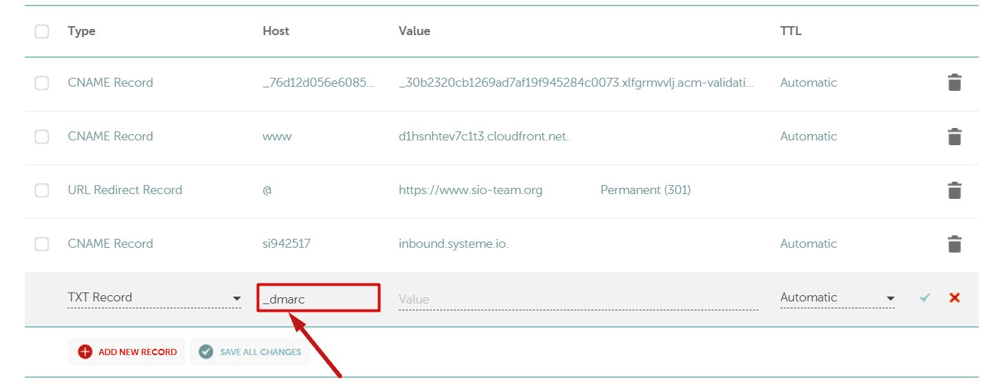 2. Στο πεδίο Host, εισαγάγετε _dmarc (όπως φαίνεται στη στήλη Όνομα των οδηγιών εγκατάστασης του systeme.io).