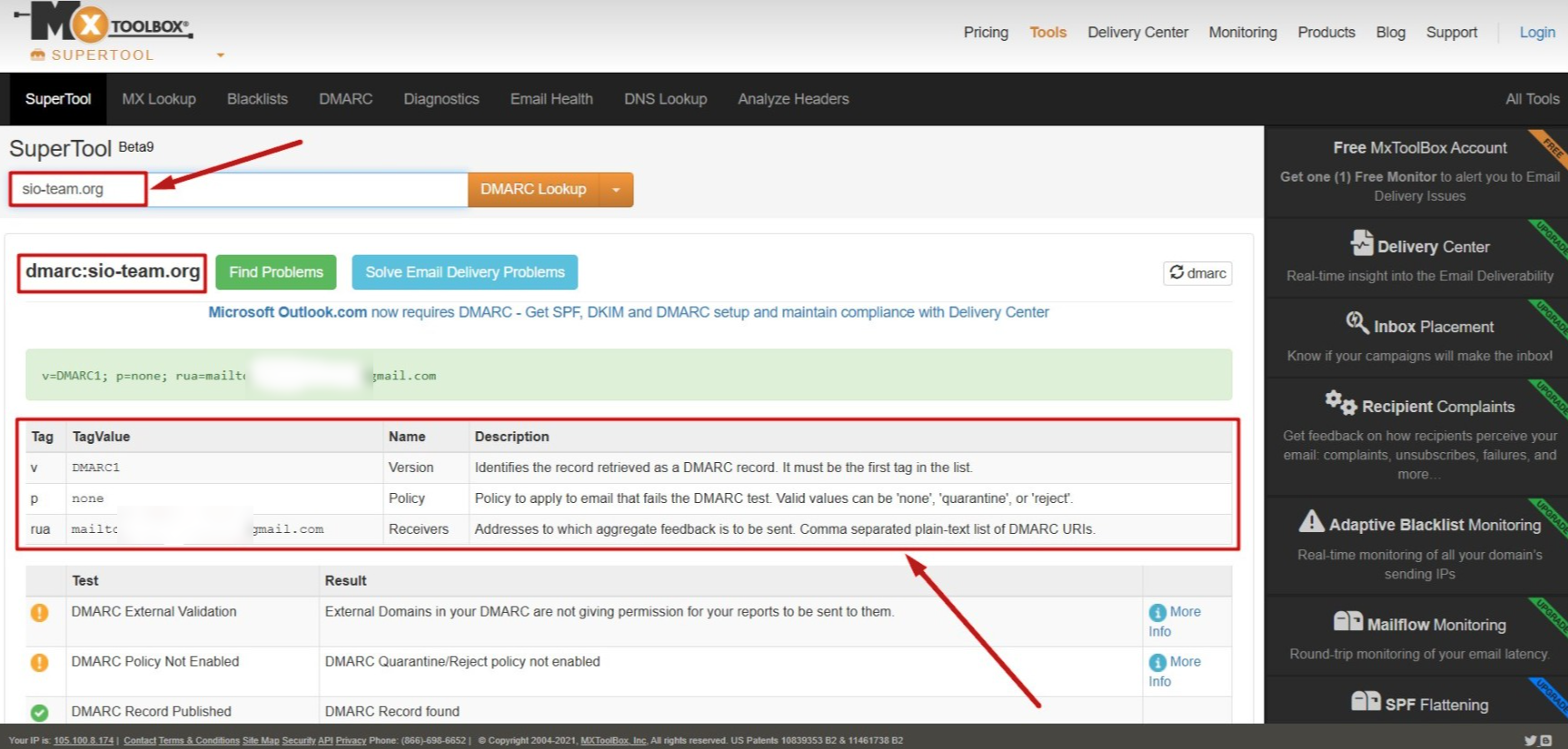 4. Μπορείτε να ελέγξετε ότι η εγγραφή DMARC έχει προστεθεί σωστά αναζητώντας το όνομα χώρου σας στον ιστότοπο https://mxtoolbox.com/dmarc.aspx