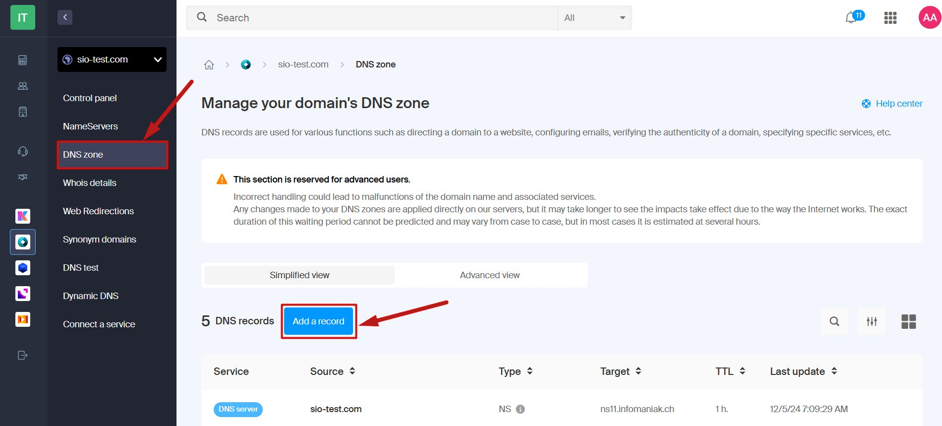 Για να προσθέσετε την εγγραφή DMARC, συνδεθείτε στο ταμπλό της Infomaniak και μεταβείτε στις ρυθμίσεις DNS (DNS zone) για το domain σας.