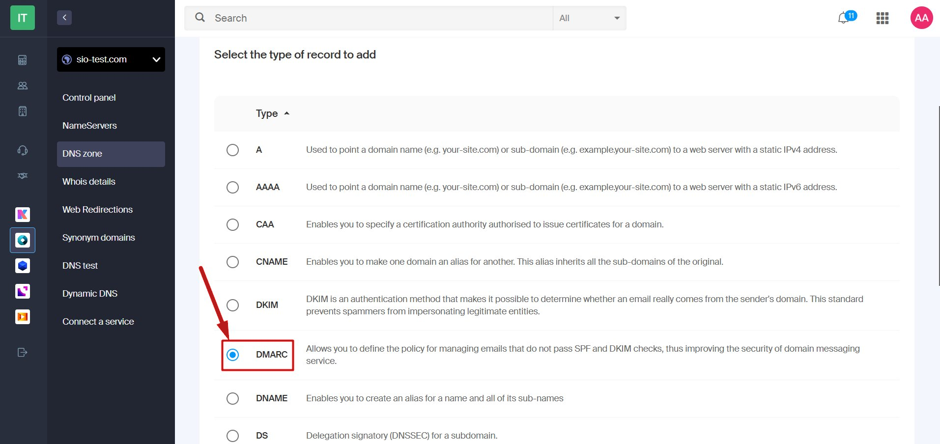 2. Επιλέξτε DMARC ως τύπο εγγραφής.