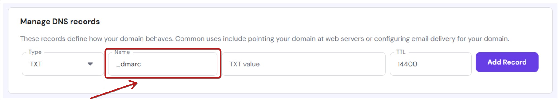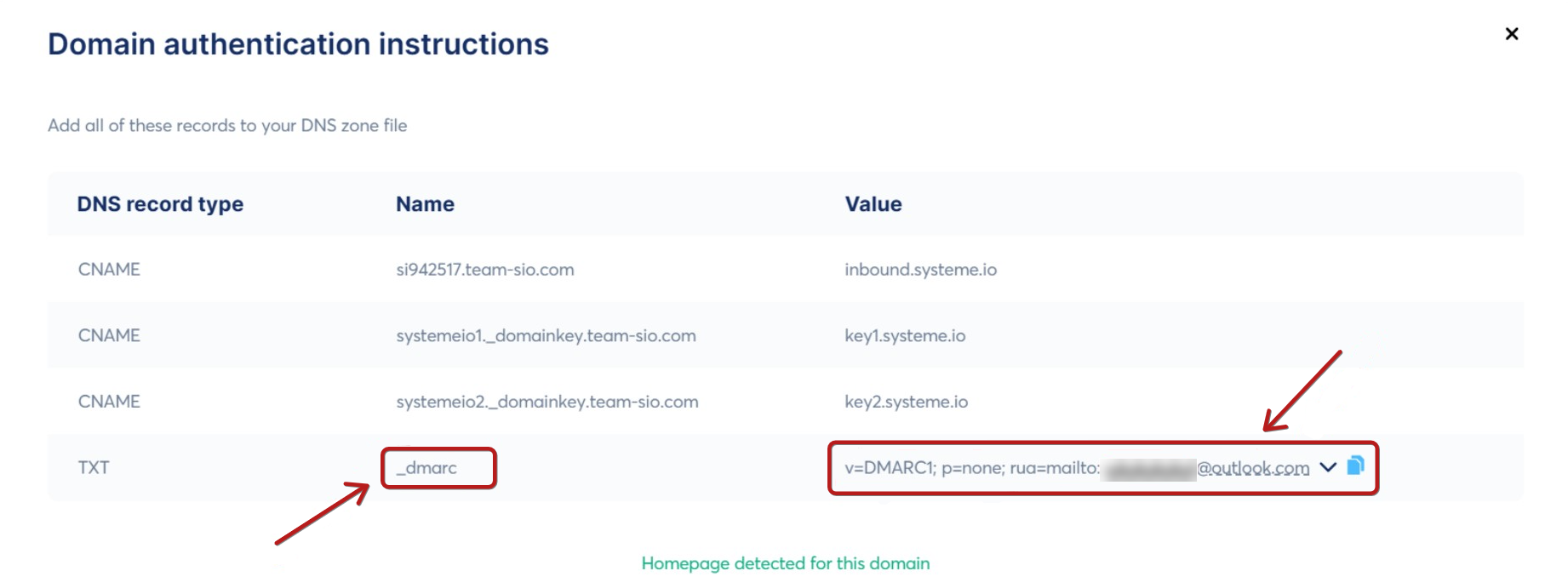 Ένα από τα απαραίτητα βήματα για την ολοκλήρωση της αυθεντικοποίησης του domain σας είναι η προσθήκη μιας εγγραφής DMARC. Μπορείτε να βρείτε τις απαραίτητες τιμές στο αναδυόμενο παράθυρο που περιέχει τις εγγραφές DNS σας.