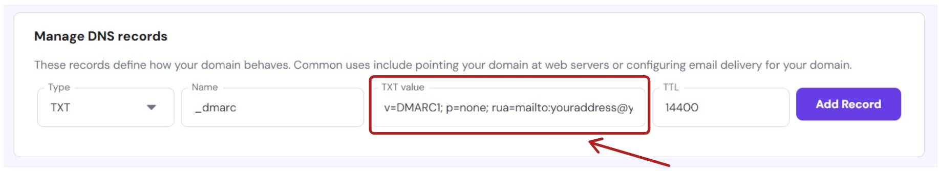 - v=DMARC1; p=none; rua=mailto:youraddress@yourdomain.com