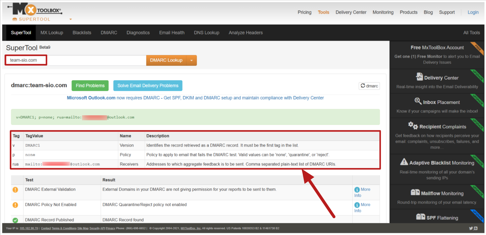 4. Μπορείτε να επαληθεύσετε ότι η εγγραφή DMARC έχει ρυθμιστεί σωστά αναζητώντας το domain σας στο https://mxtoolbox.com/dmarc.aspx