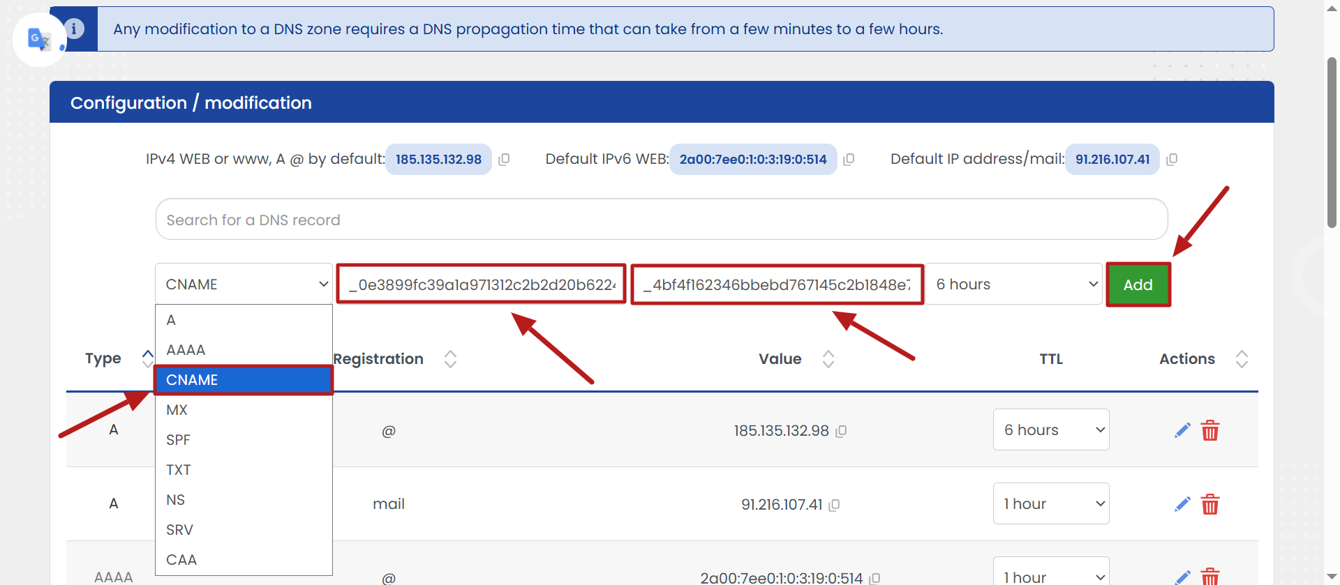 - Μερικές φορές, ο πάροχός σας ενδέχεται να μην μπορεί να καταχωρίσει μια εγγραφή CNAME λόγω σύγκρουσης με άλλες υπάρχουσες εγγραφές DNS. Αυτό συμβαίνει συνήθως κατά την προσθήκη του πρώτου CNAME. Εάν συμβεί αυτό, επικοινωνήστε με την υποστήριξη του παρόχου σας για να διαπιστώσετε εάν αυτές οι υπάρχουσες εγγραφές είναι απαραίτητες ή εάν μπορούν να διαγραφούν με ασφάλεια.