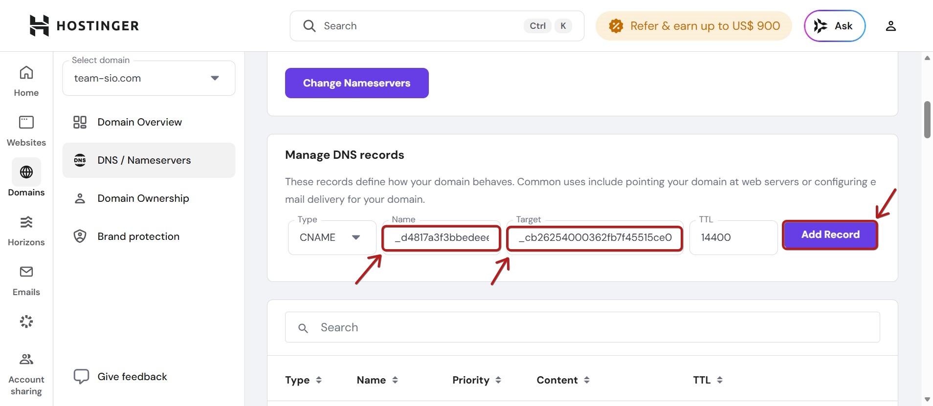 Σε αυτή τη σελίδα, θα μάθετε πώς να προσθέτετε εγγραφές DNS στη Hostinger για να συνδέσετε το κύριο όνομα domain σας. Αυτό θα σας επιτρέψει να προσθέσετε ολόκληρο τον ιστότοπό σας (www.domain.com) στο systeme.io για να το χρησιμοποιήσετε ως προσαρμοσμένο domain στα sales funnels και τα ιστολόγιά σας, γεγονός που βοηθά στην ενίσχυση της επωνυμίας σας.