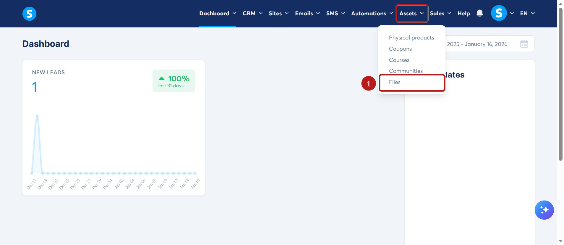 Στον λογαριασμό σας στο systeme.io, κάντε κλικ στο Termékek στο μενού και, στη συνέχεια, στο Files (Αρχεία) (1).