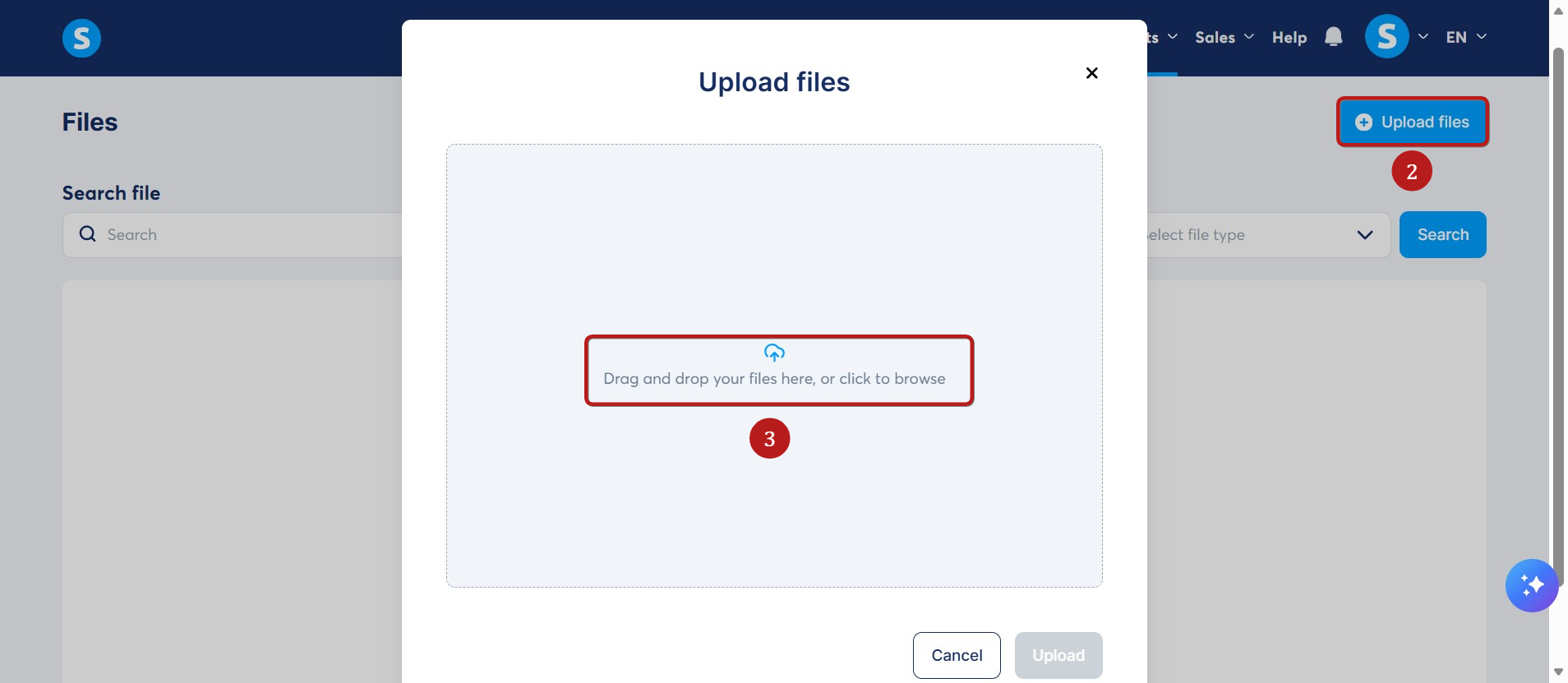 Κάντε κλικ στο κουμπί Upload files (Μεταφόρτωση αρχείων) (2) στην επάνω δεξιά γωνία για να ανοίξετε το αναδυόμενο παράθυρο μεταφόρτωσης.