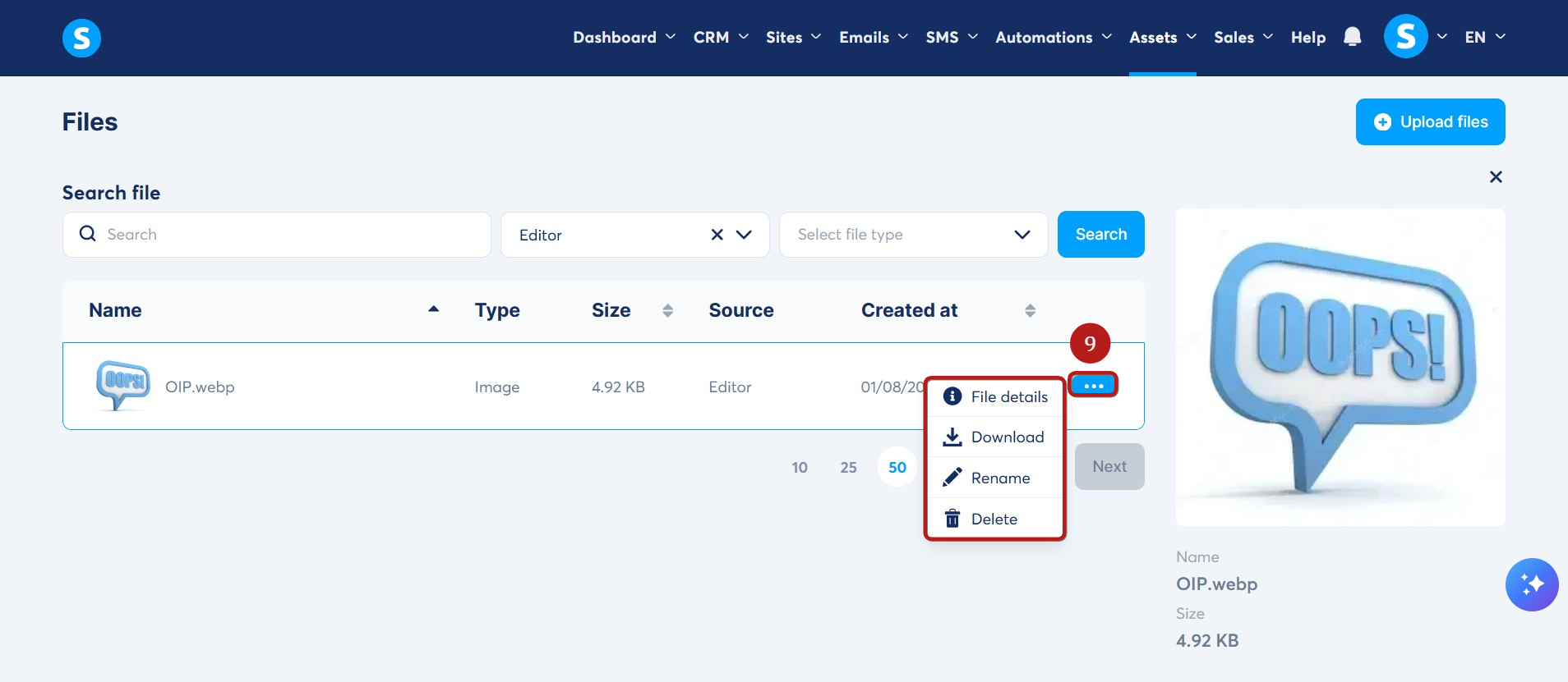 Κάντε κλικ στις τρεις τελείες (8) δίπλα σε ένα αρχείο για να το επεξεργαστείτε, να το δείτε, να το κατεβάσετε ή να το διαγράψετε.