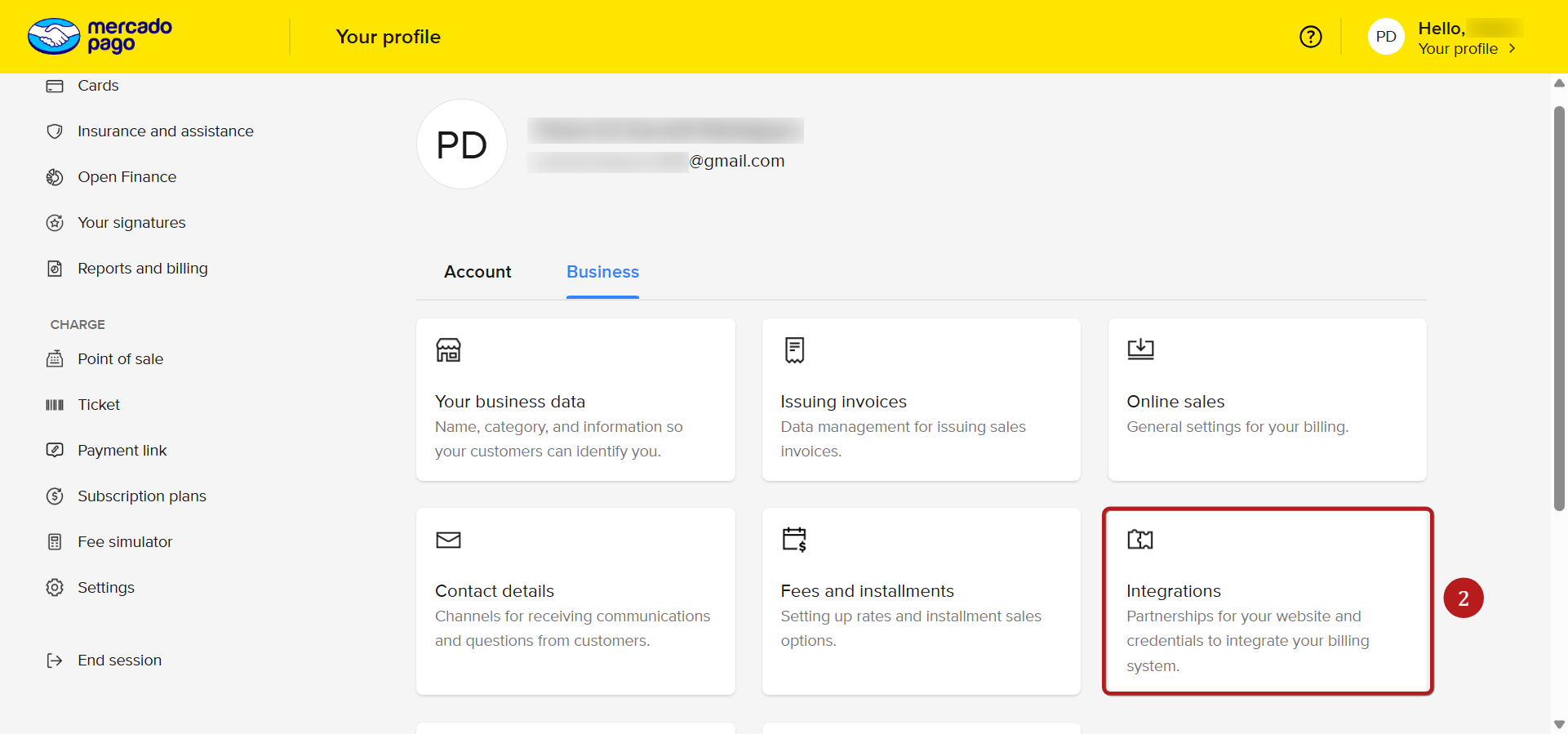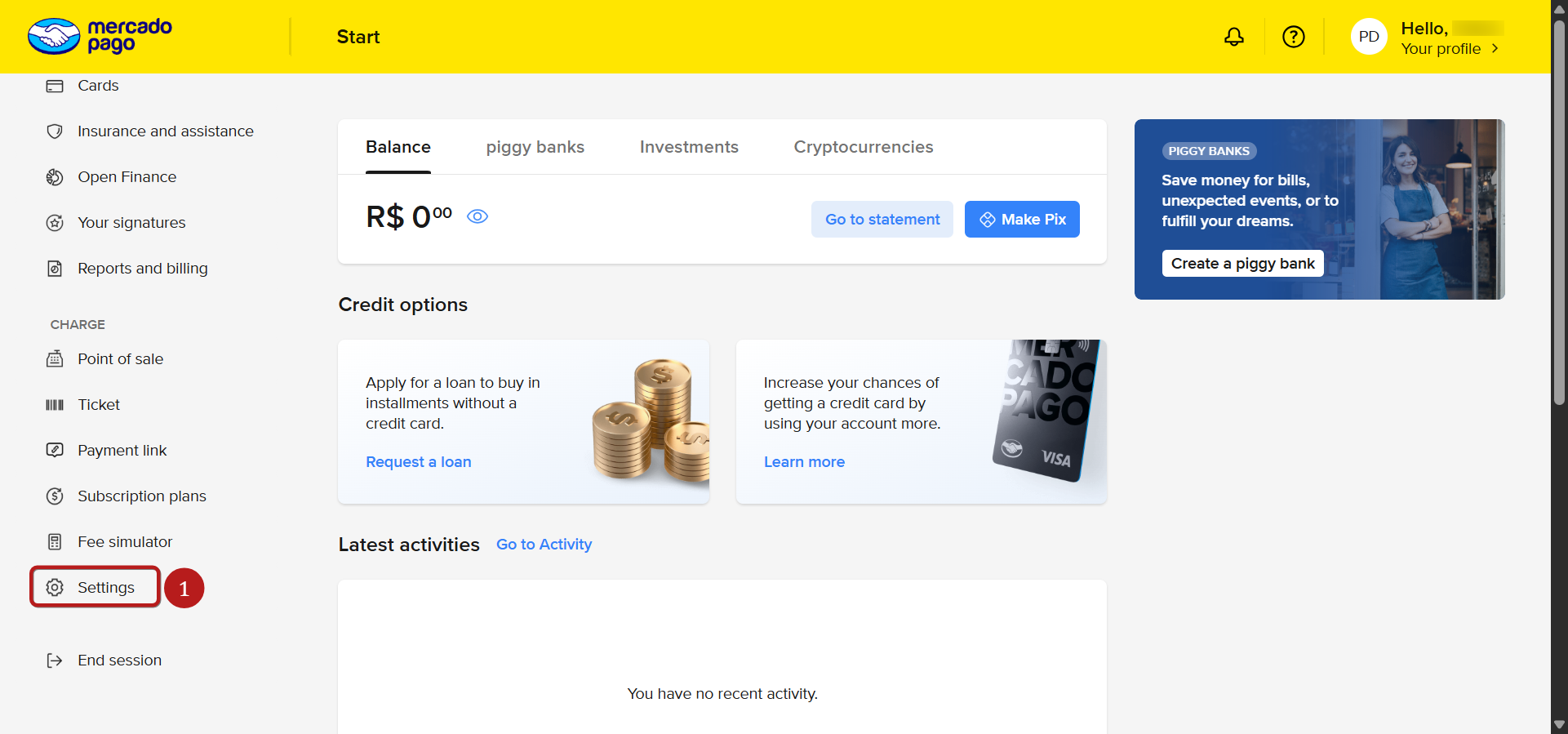 1.1 Στον κεντρικό πίνακα του λογαριασμού σας Mercado Pago, κάντε κλικ στο Ρυθμίσεις (1).