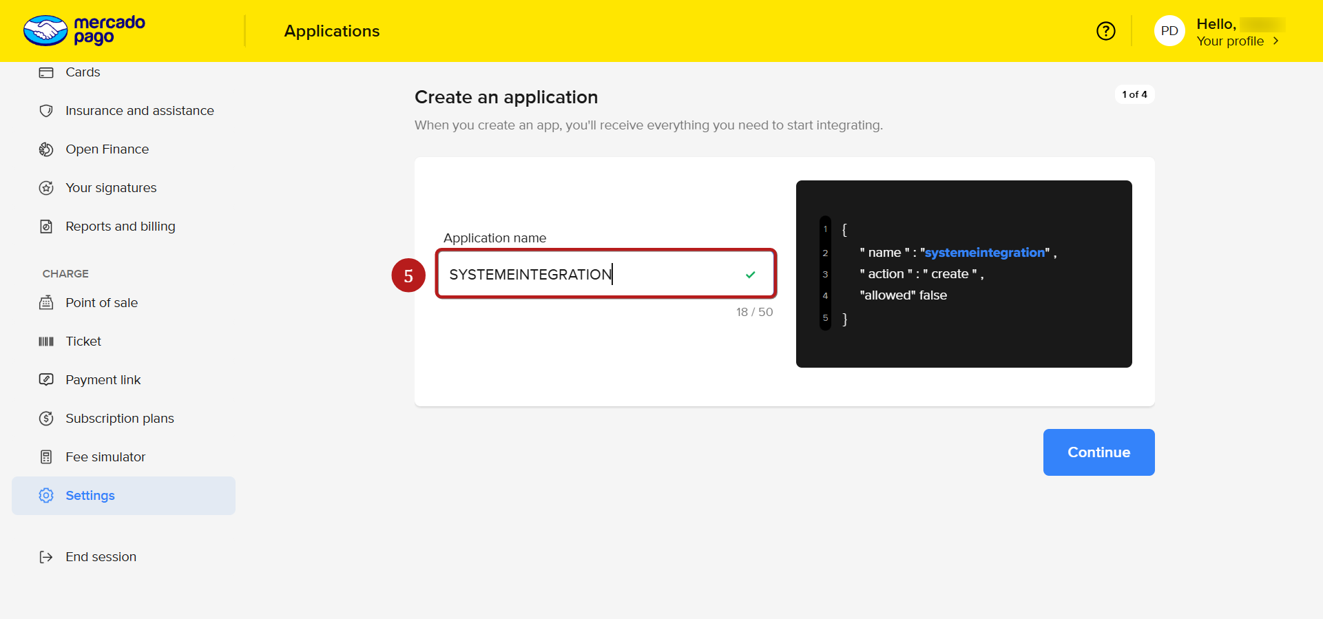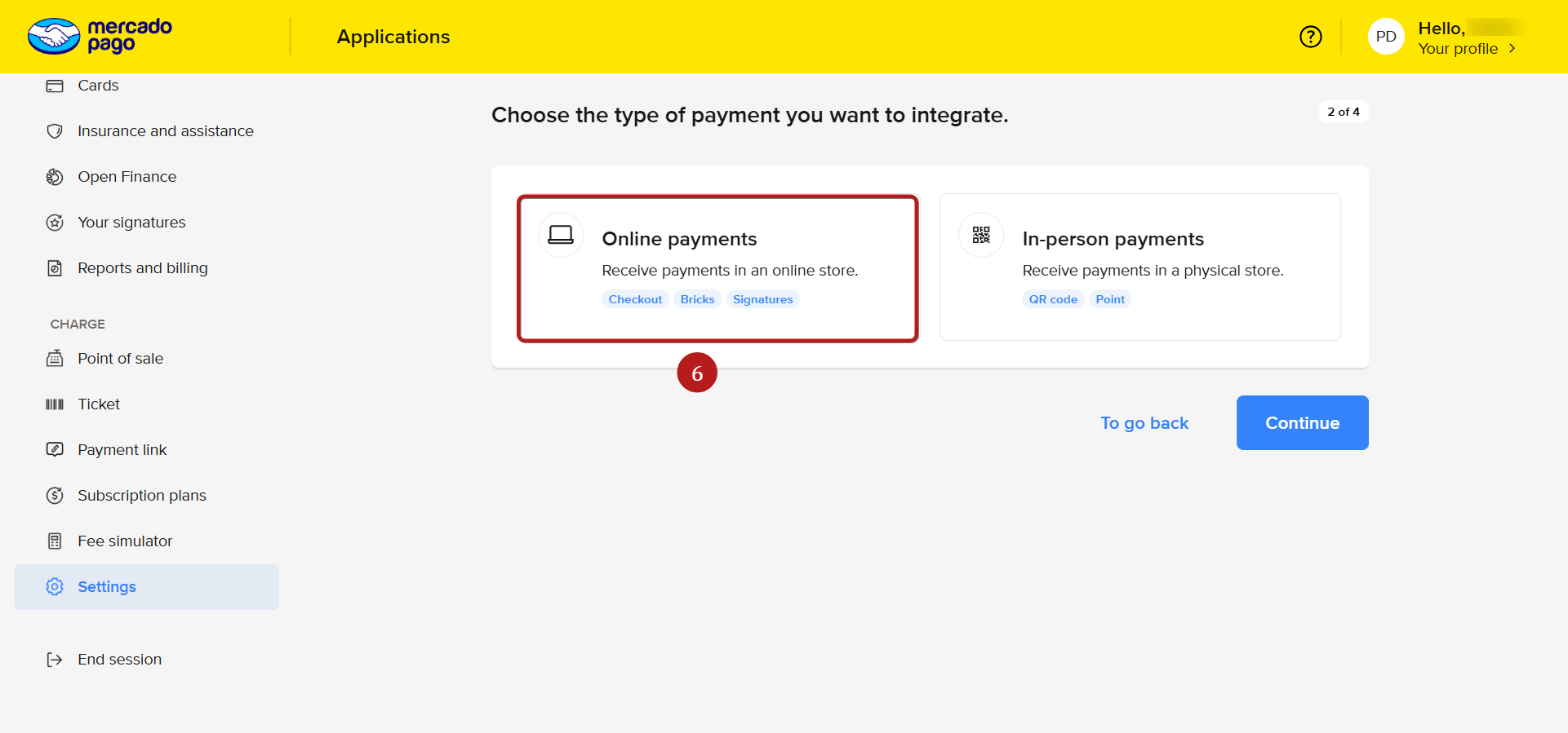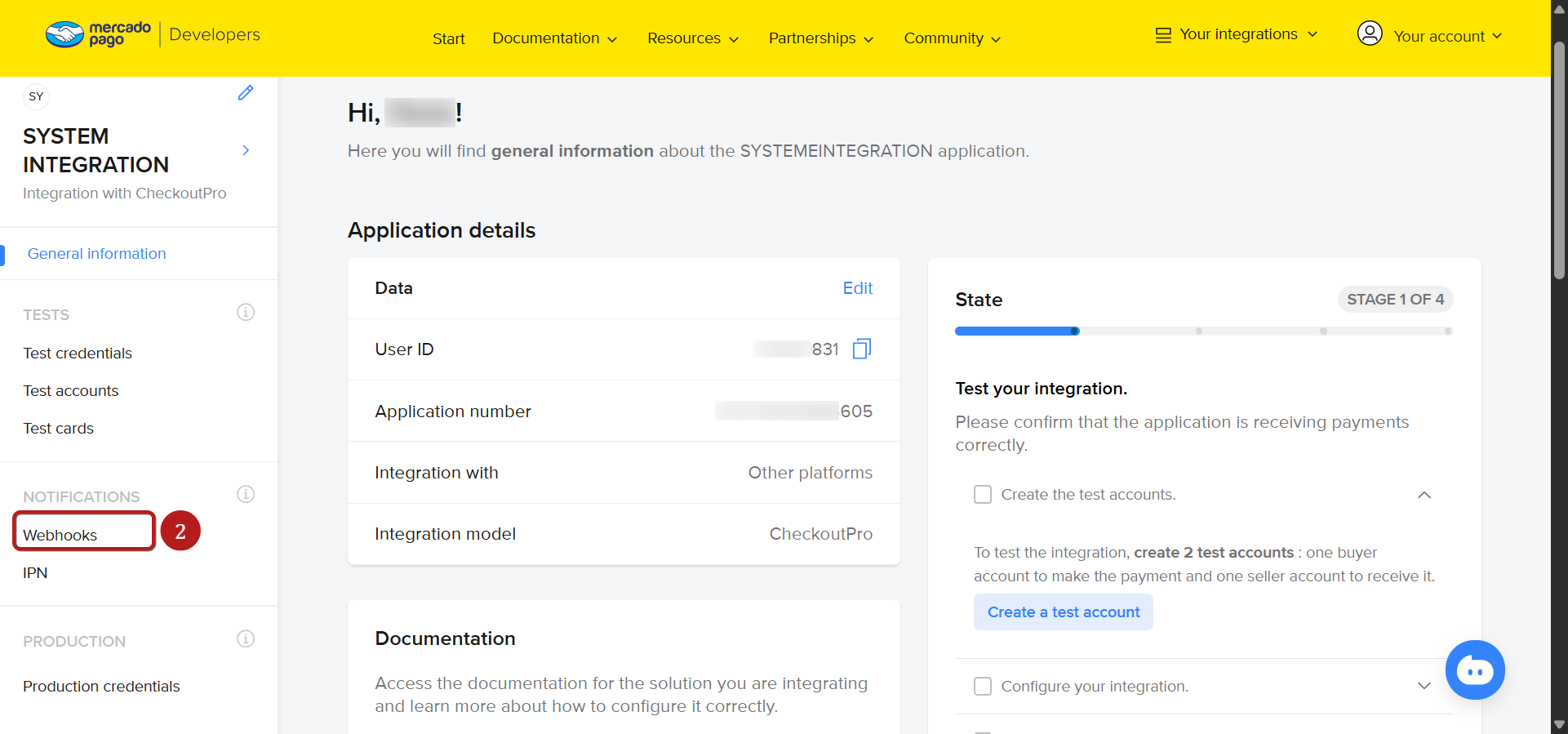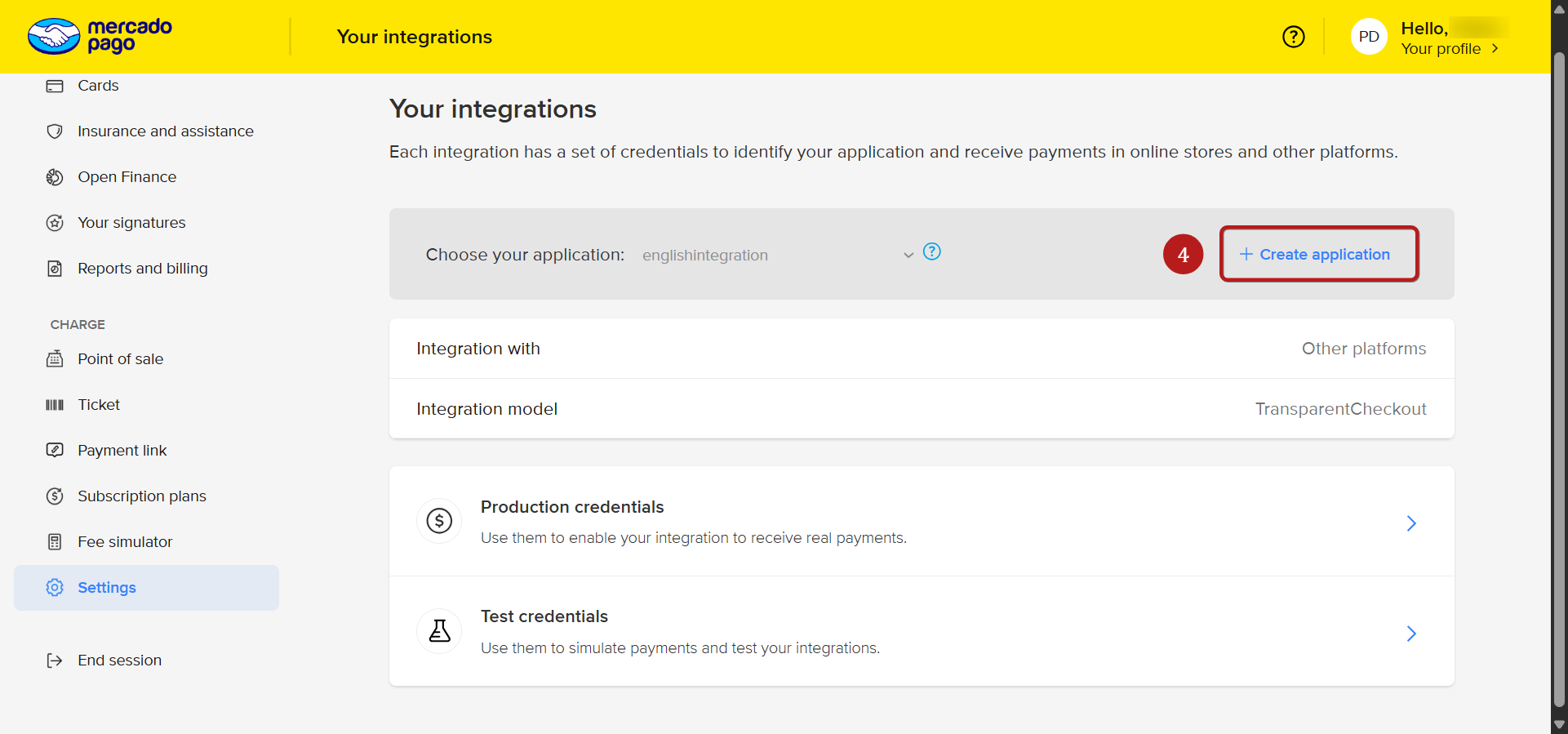 2.2 Συνδεθείτε στον λογαριασμό σας Mercado Pago και μεταβείτε στο πάνελ προγραμματιστών (https://www.mercadopago.com.br/developers/el), και μετά κάντε κλικ στην εφαρμογή που δημιουργήσατε στο προηγούμενο βήμα.