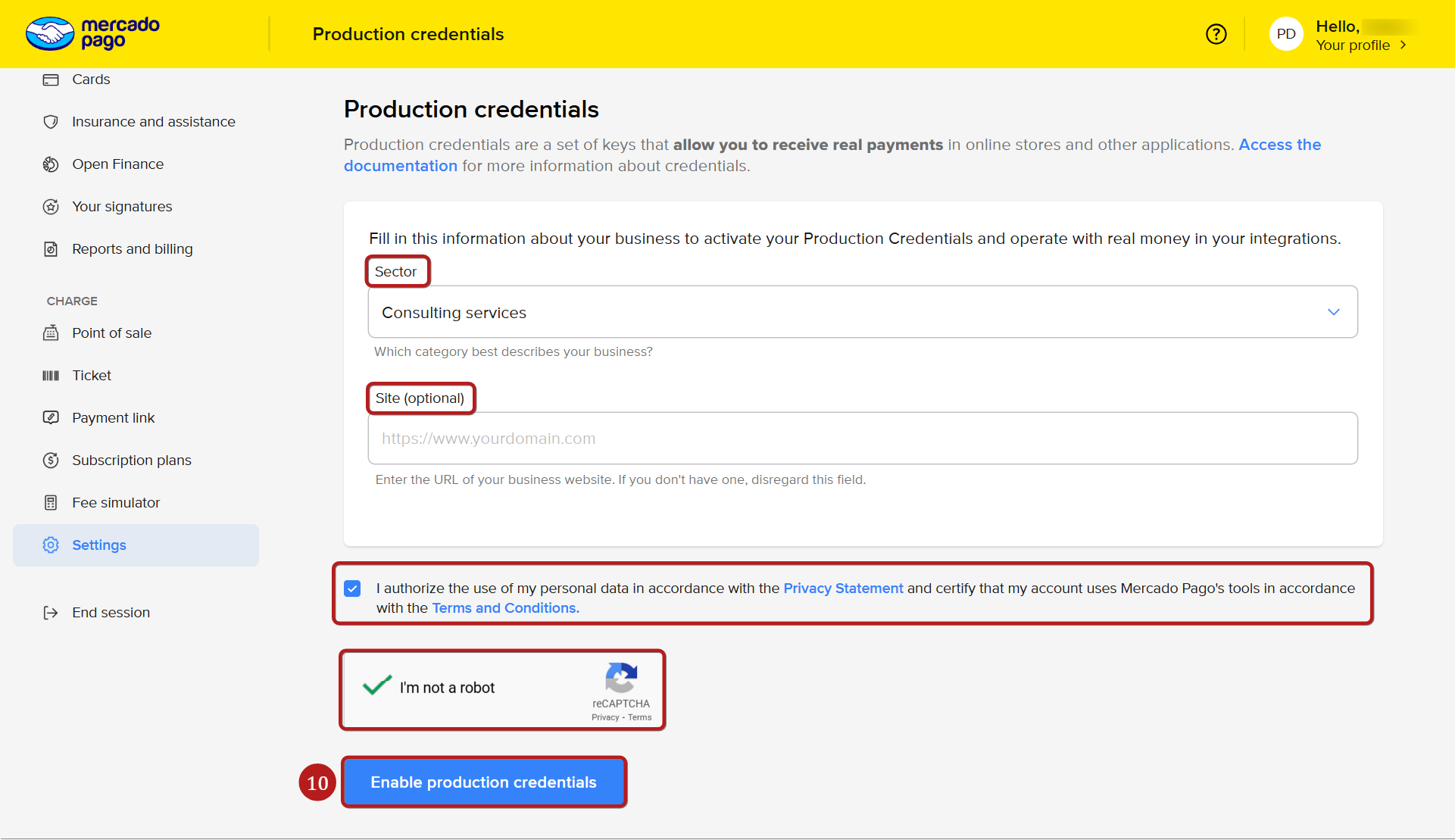 Τέλος, κάντε κλικ στο μπλε κουμπί Ενεργοποίηση διαπιστευτηρίων παραγωγής (10).