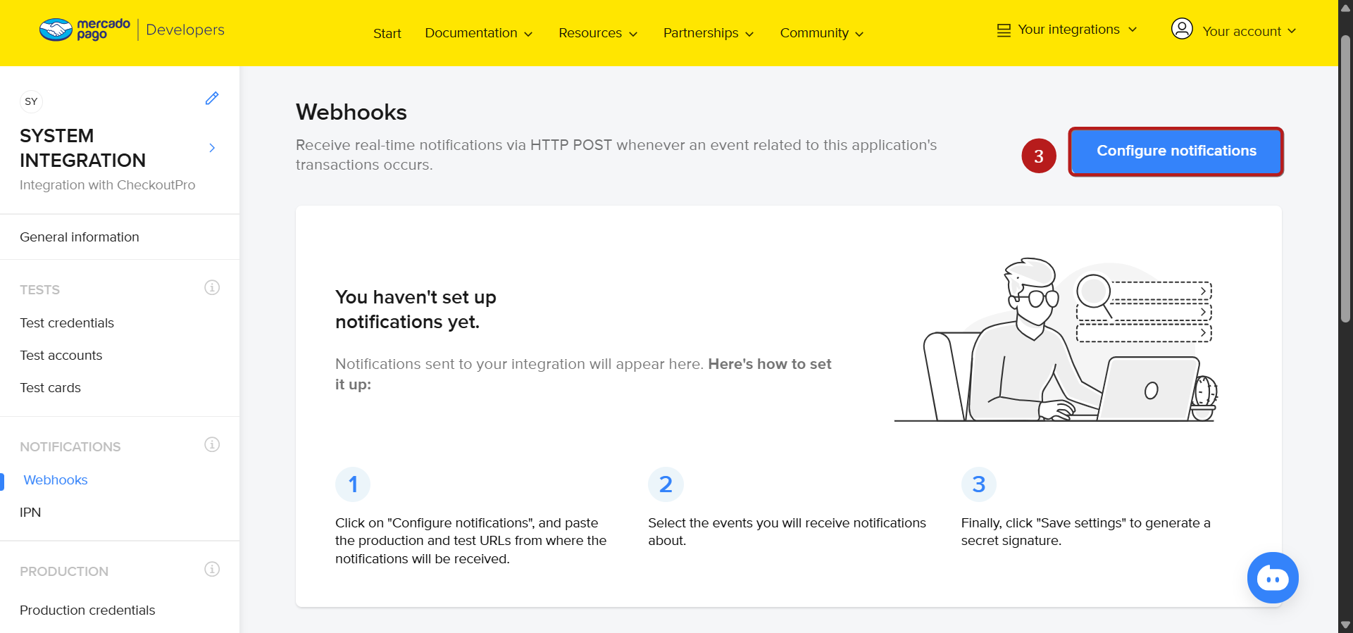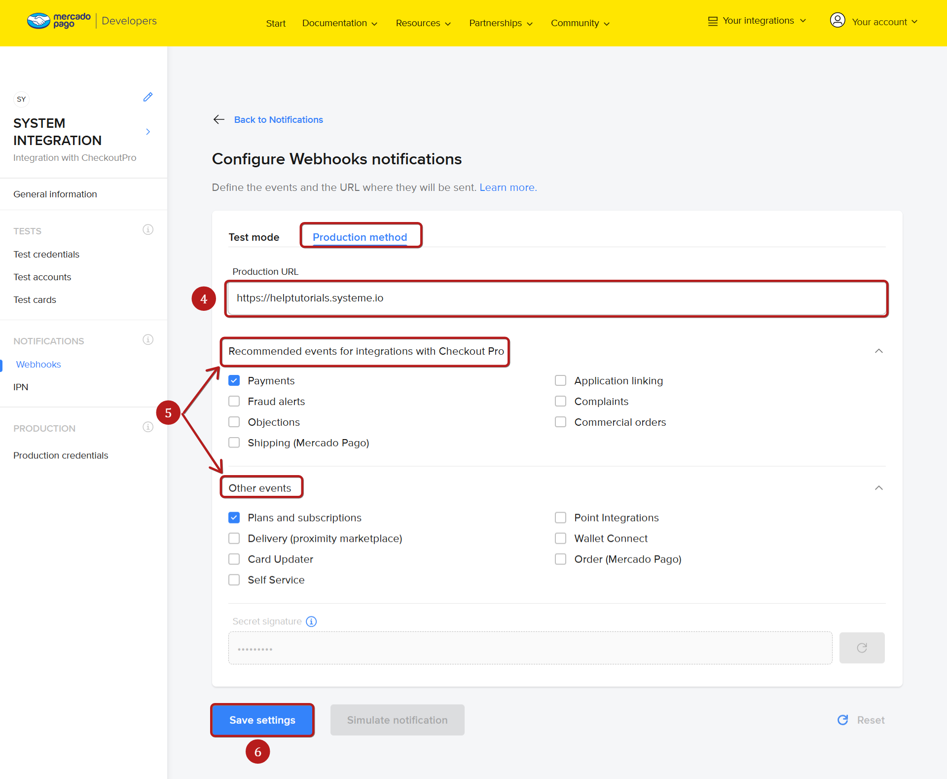 Μόλις ολοκληρωθεί η ενσωμάτωση, θα λάβετε μια διεύθυνση URL webhook που πρέπει να εισαχθεί στο ταμπλό του λογαριασμού σας Mercado Pago για να επιτραπεί στο systeme.io να επεξεργάζεται τα συμβάντα πληρωμής.