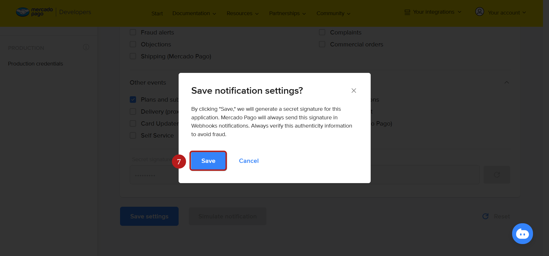 Θα εμφανιστεί ένα αναδυόμενο παράθυρο για την αποθήκευση των ρυθμίσεων ειδοποίησης webhook. Κάντε κλικ στο Αποθήκευση (7) για να επιβεβαιώσετε την ενέργεια.