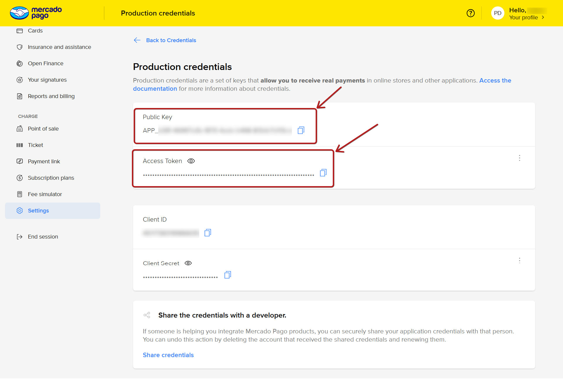 1.7 Η Mercado Pago θα πρέπει τώρα να έχει δημιουργήσει τα ακόλουθα διαπιστευτήρια παραγωγής: