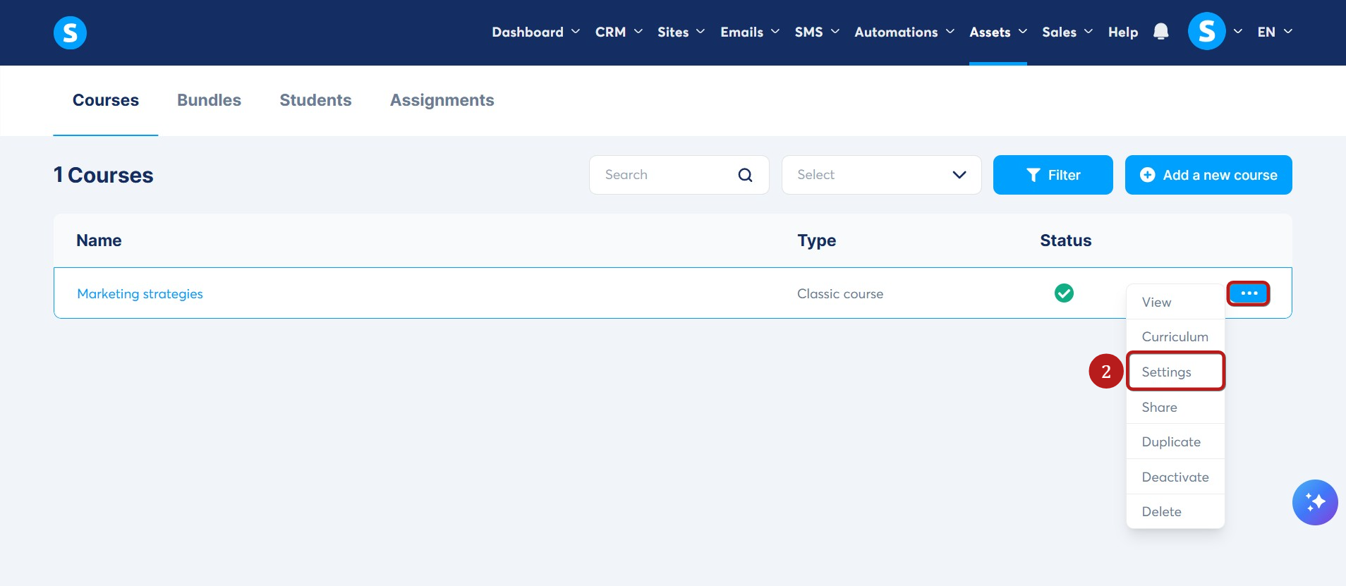 Κάντε κλικ στις τρεις τελείες δίπλα στο μάθημά σας και μετά επιλέξτε Ρυθμίσεις (2).
