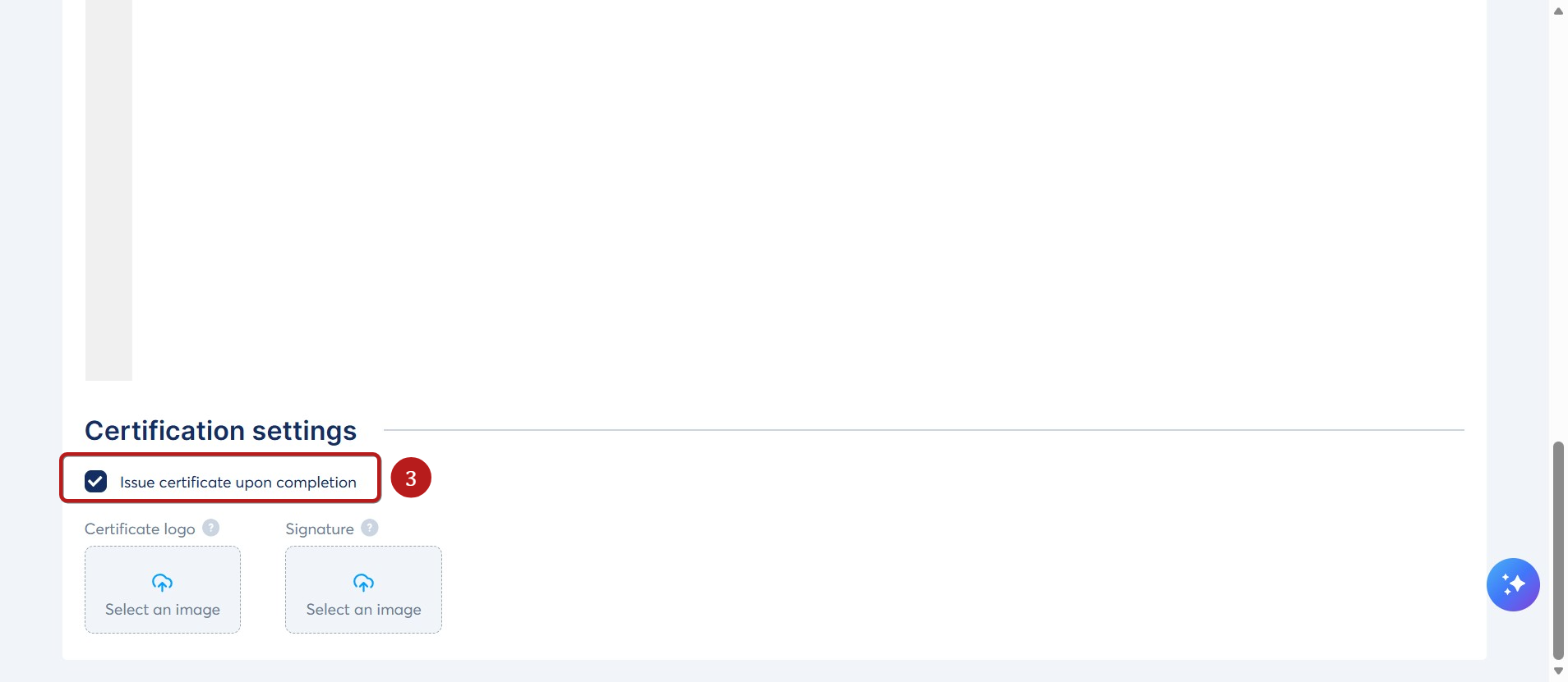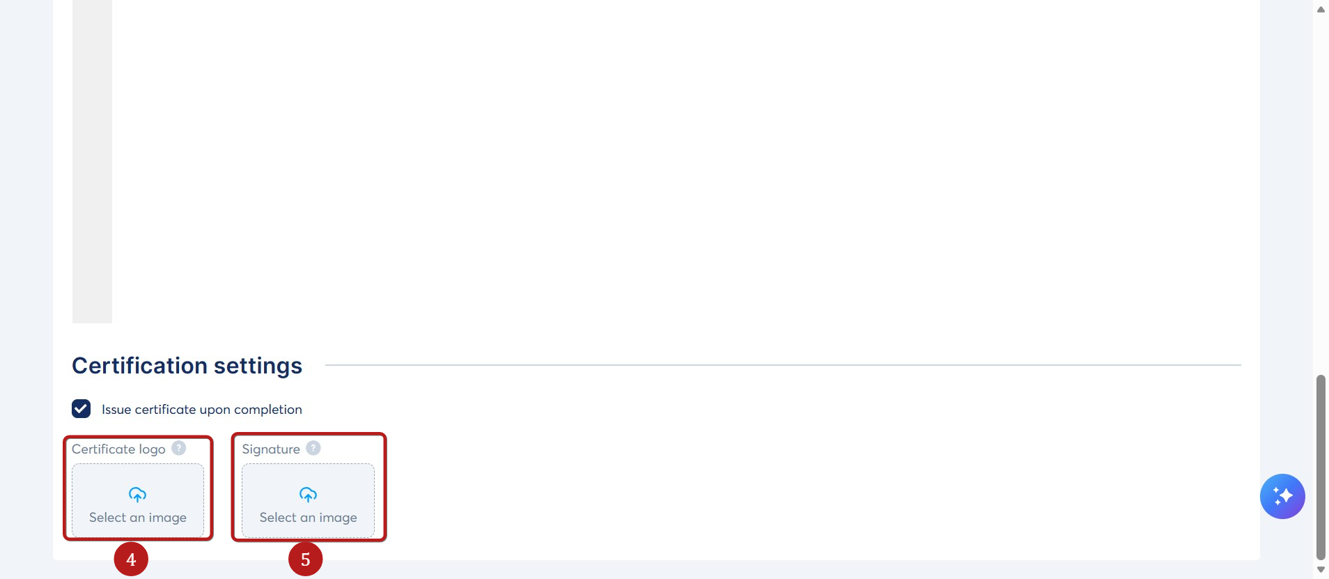 Προσθήκη Λογοτύπου Πιστοποιητικού (4): Μεταφορτώστε το λογότυπο του οργανισμού σας για να εμφανίζεται στο πιστοποιητικό. Αυτό βοηθά στην ενίσχυση της ταυτότητας της επωνυμίας σας όταν οι μαθητές κατεβάζουν τα πιστοποιητικά ολοκλήρωσής τους.