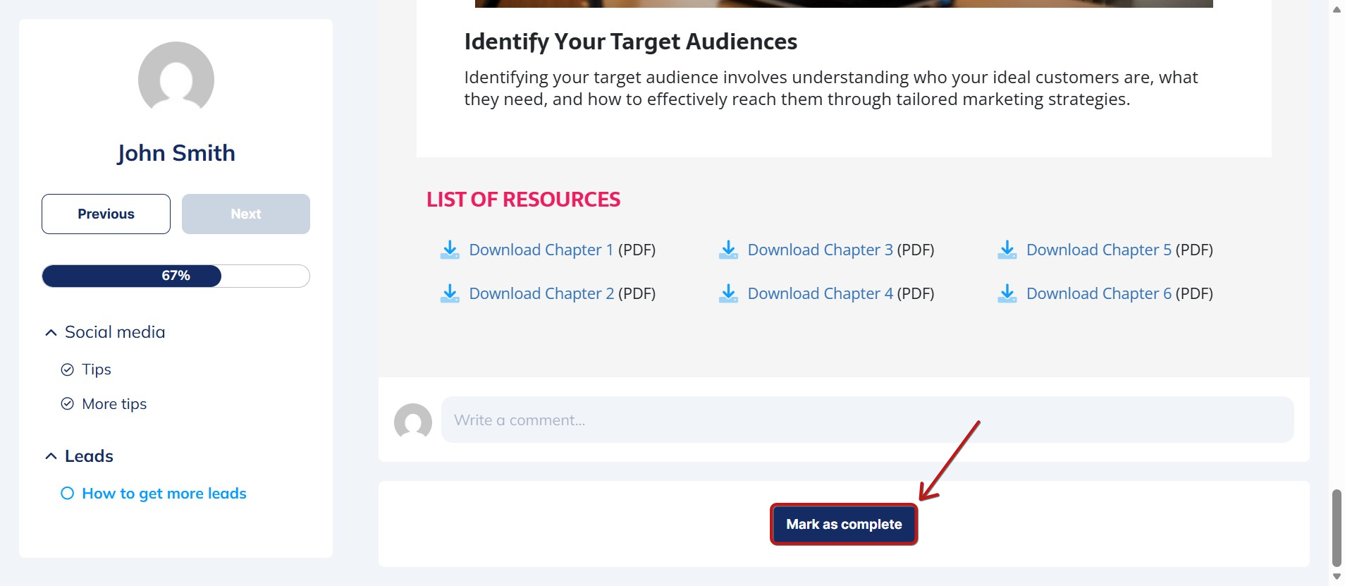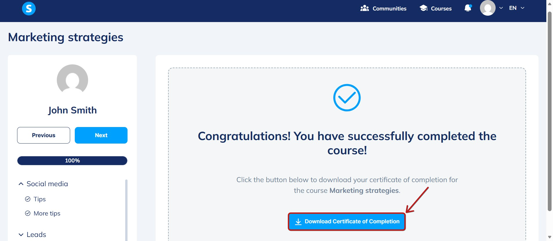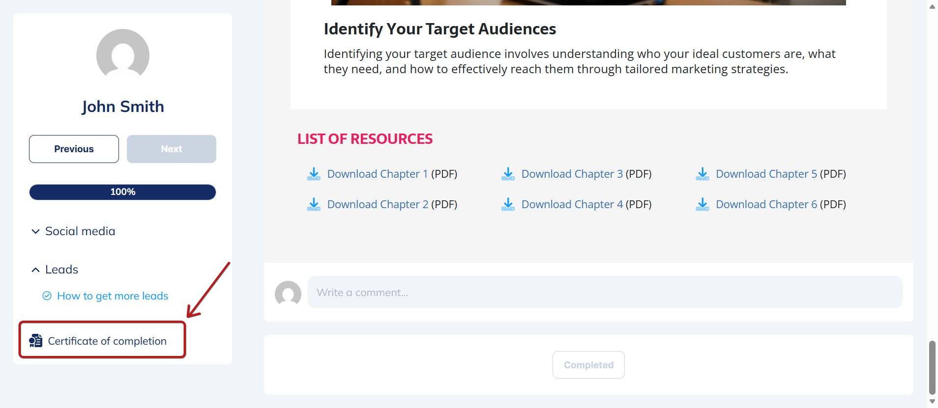 Ο μαθητής πρέπει να σημειώσει όλες τις διαλέξεις του μαθήματος ως ολοκληρωμένες για να φτάσει στο 100% της προόδου προτού μπορέσει να κατεβάσει το πιστοποιητικό.