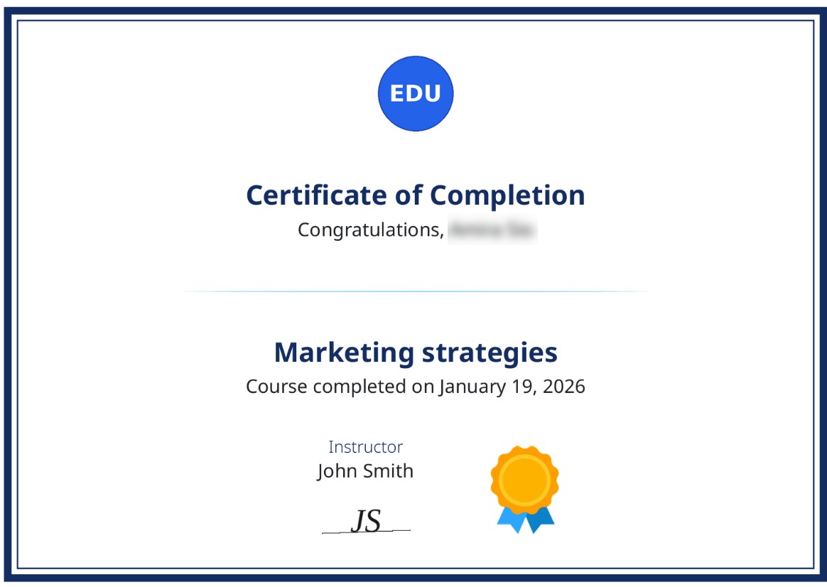 Εδώ είναι ένα παράδειγμα ενός εξατομικευμένου πιστοποιητικού που δημιουργήθηκε από το systeme.io.