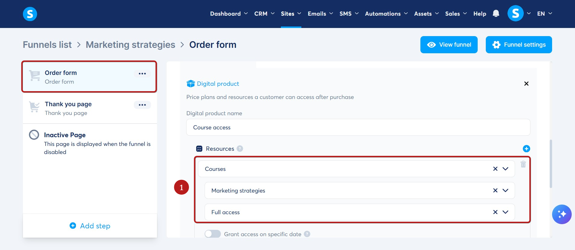 Για να παραχωρήσετε αυτόματα πρόσβαση σε μάθημα μετά από μια αγορά, πρέπει να διαμορφώσετε τις ρυθμίσεις στην ενότητα πόρων της Φόρμας παραγγελίας στο Funnelek πωλήσεών σας (1).