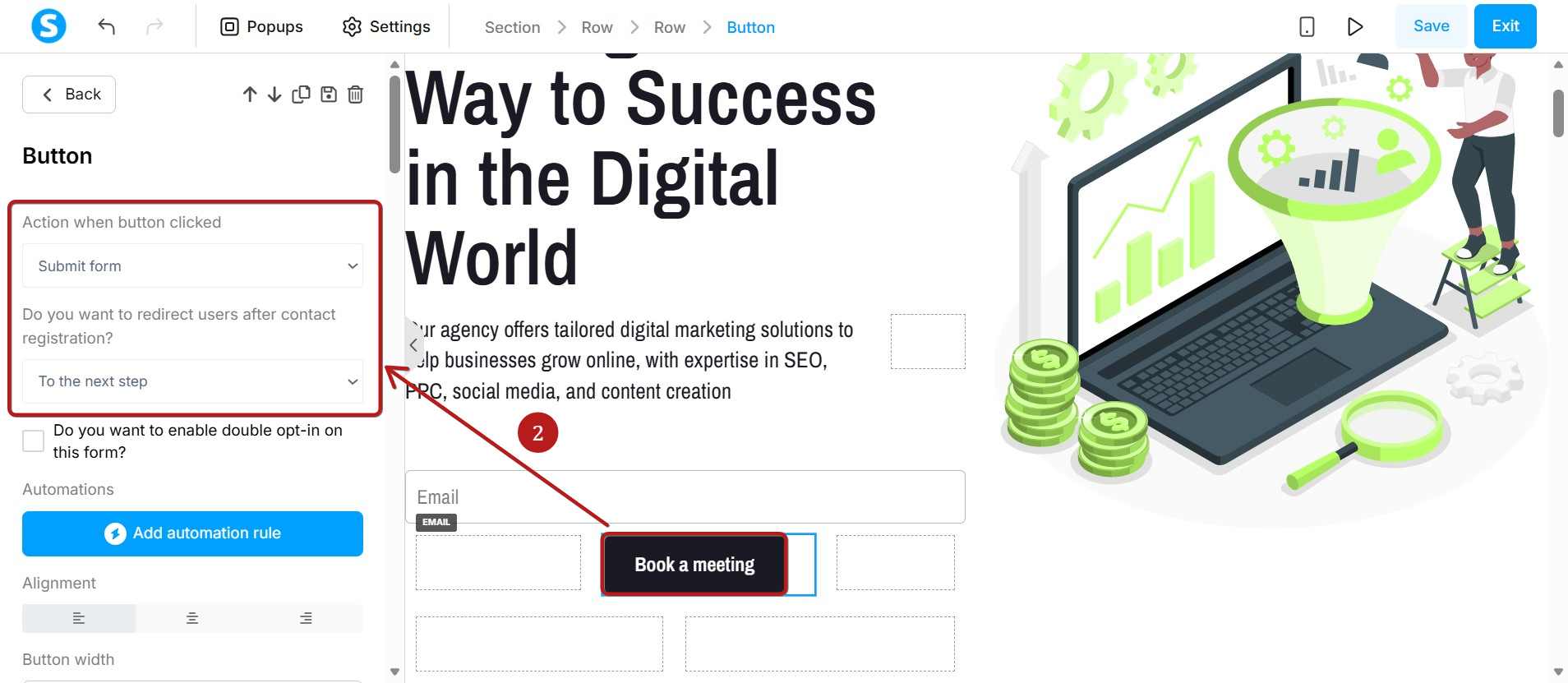 α. Επιλέξτε Υποβολή φόρμας ως ενέργεια του κουμπιού της φόρμας και, στη συνέχεια, ανακατευθύνετε τους συνδρομητές στη σελίδα της επιλογής σας (2).