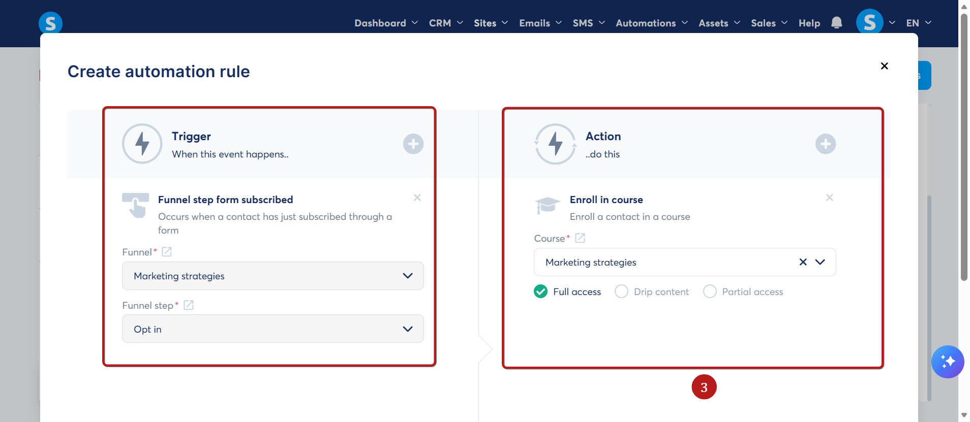 β. Προσθέστε έναν κανόνα αυτοματισμού με έναυσμα Εγγραφή σε φόρμα βήματος Funnelek και ενέργεια Εγγραφή σε μάθημα (3).