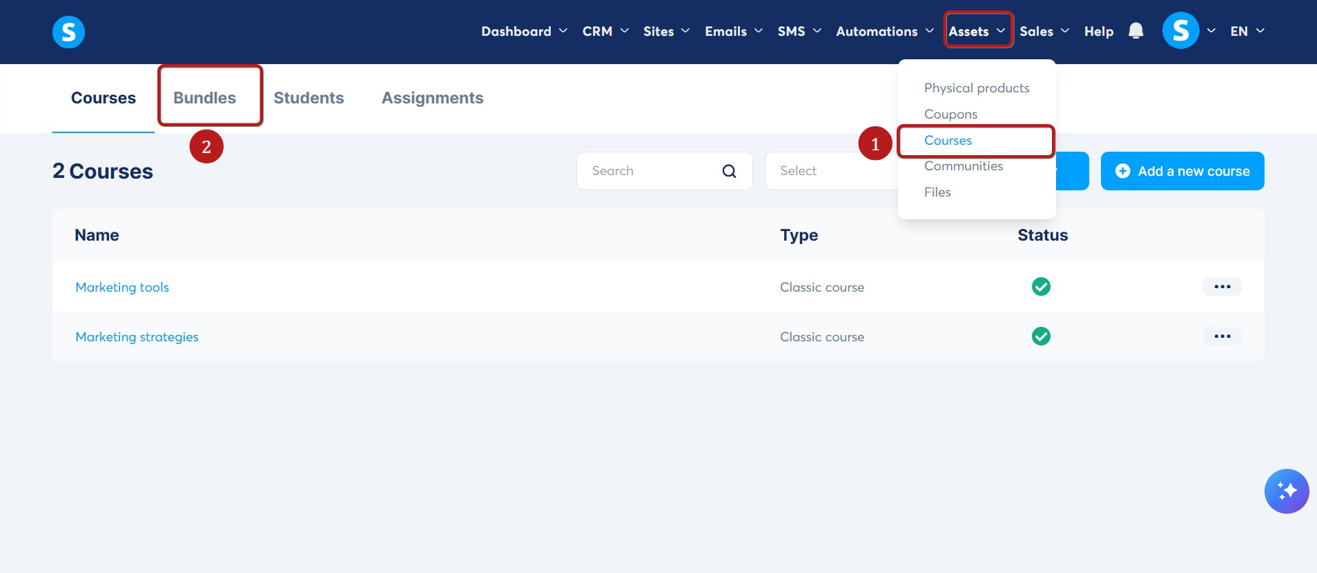 Στο Μενού, κάντε κλικ στο Προϊόντα, μετά στο Μαθήματα (1) και τέλος στο Πακέτα (2).