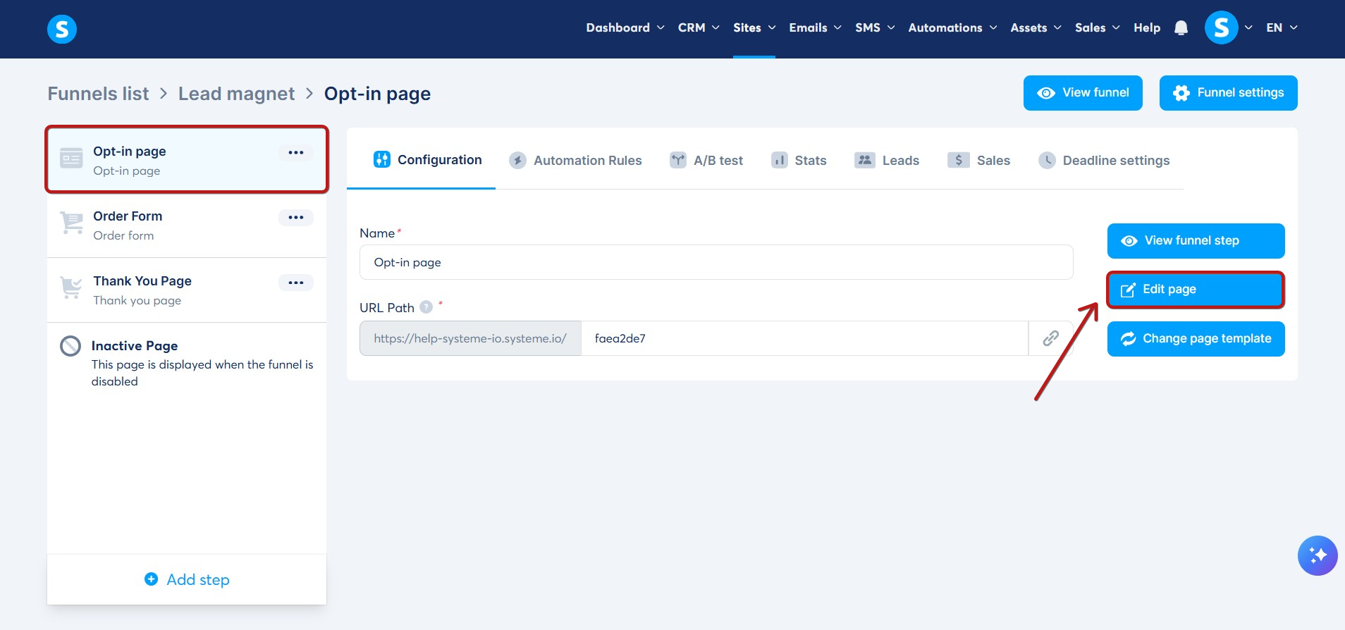 Δημιουργήστε ένα νέο Funnelek πωλήσεων με μια σελίδα opt-in και μια σελίδα ευχαριστιών. Επιλέξτε τη σελίδα opt-in και κάντε κλικ στο Επεξεργασία σελίδας για να ανοίξετε το πρόγραμμα επεξεργασίας.