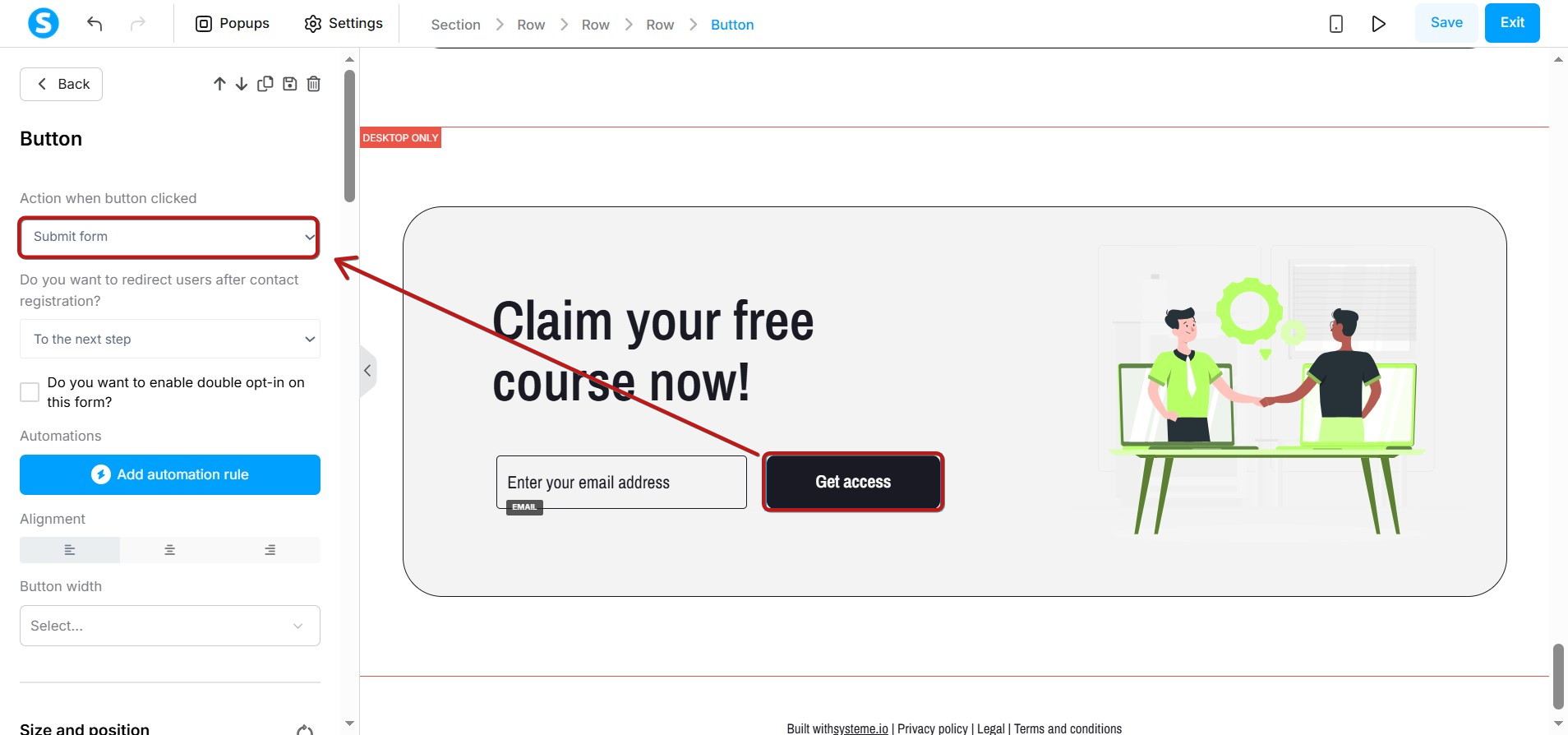 Δημιουργήστε μια φόρμα opt-in μέσα στο πρόγραμμα επεξεργασίας. Η φόρμα πρέπει να περιλαμβάνει τουλάχιστον μία Είσοδο φόρμας ρυθμισμένη σε τύπο Email, και ένα κουμπί ρυθμισμένο στην ενέργεια Υποβολή φόρμας.
