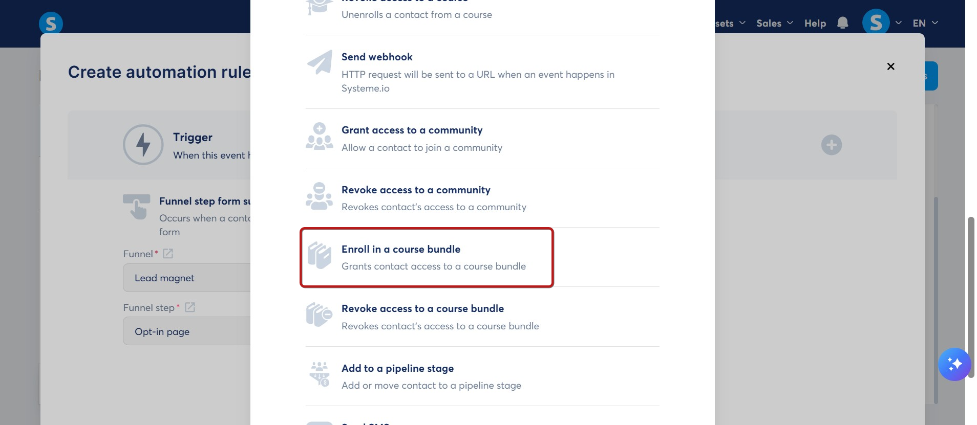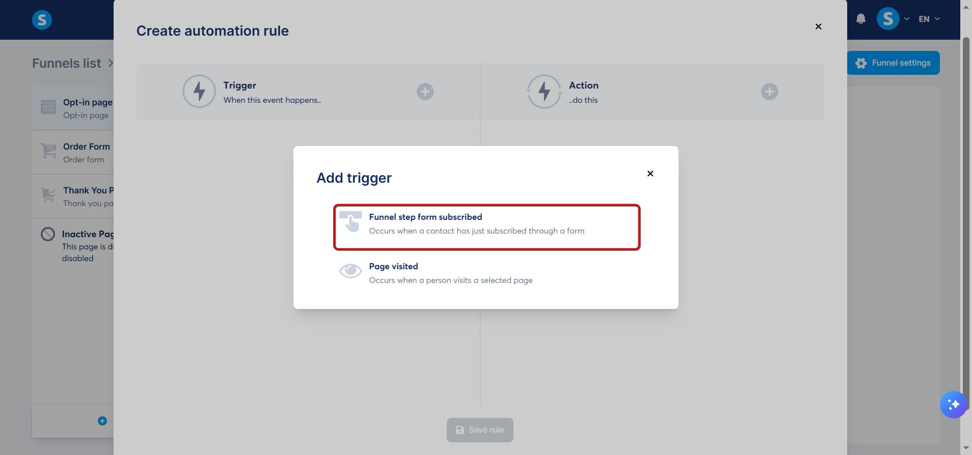 Επιλέξτε το έναυσμα Εγγραφή στη φόρμα βήματος Funnelek.