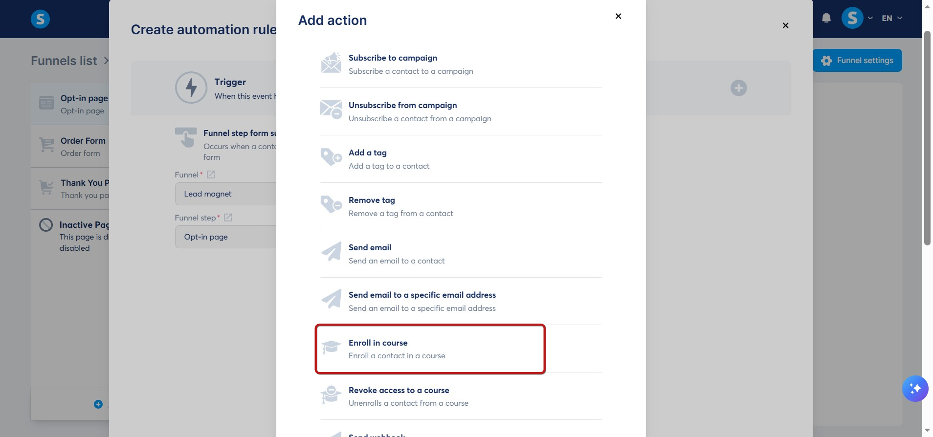 Επιλέξτε το έναυσμα Εγγραφή σε φόρμα βήματος funnel.