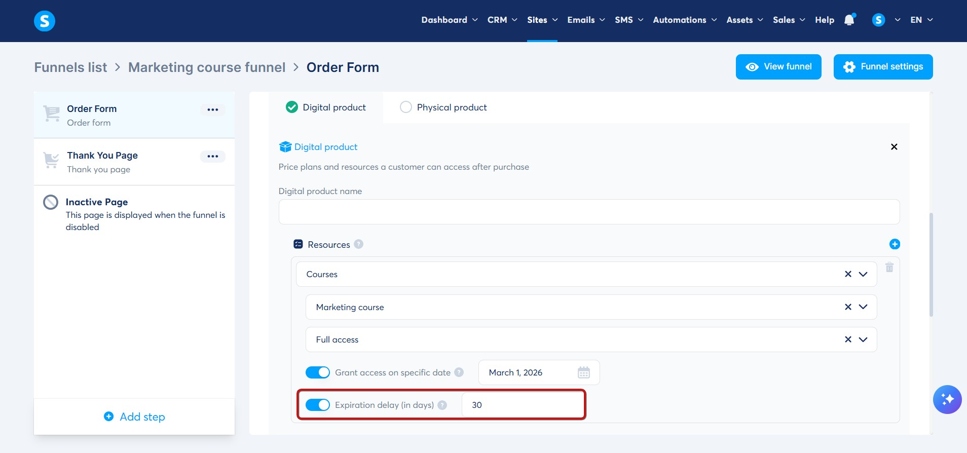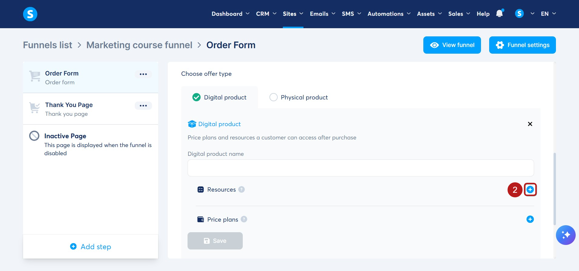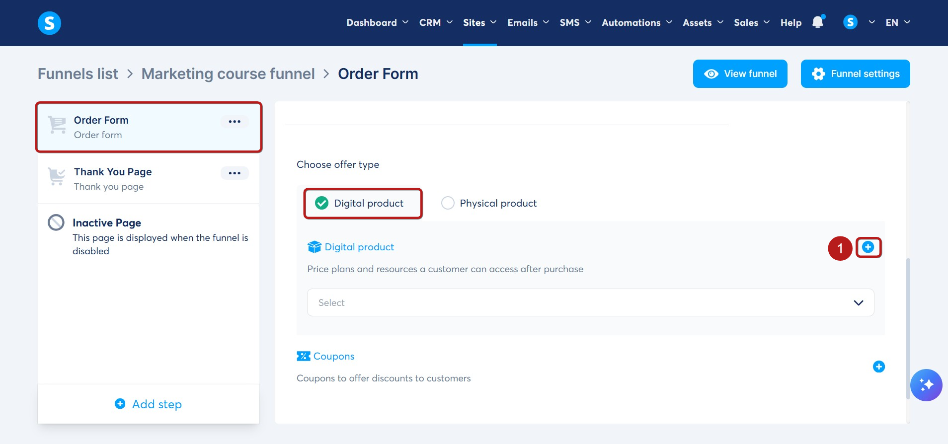 1. Μεταβείτε στο βήμα Φόρμα παραγγελίας του funnel πωλήσεων που πρόκειται να χρησιμοποιήσετε για να πουλήσετε το μάθημά σας και επιλέξτε τον τύπο προσφοράς Ψηφιακό προϊόν (1).