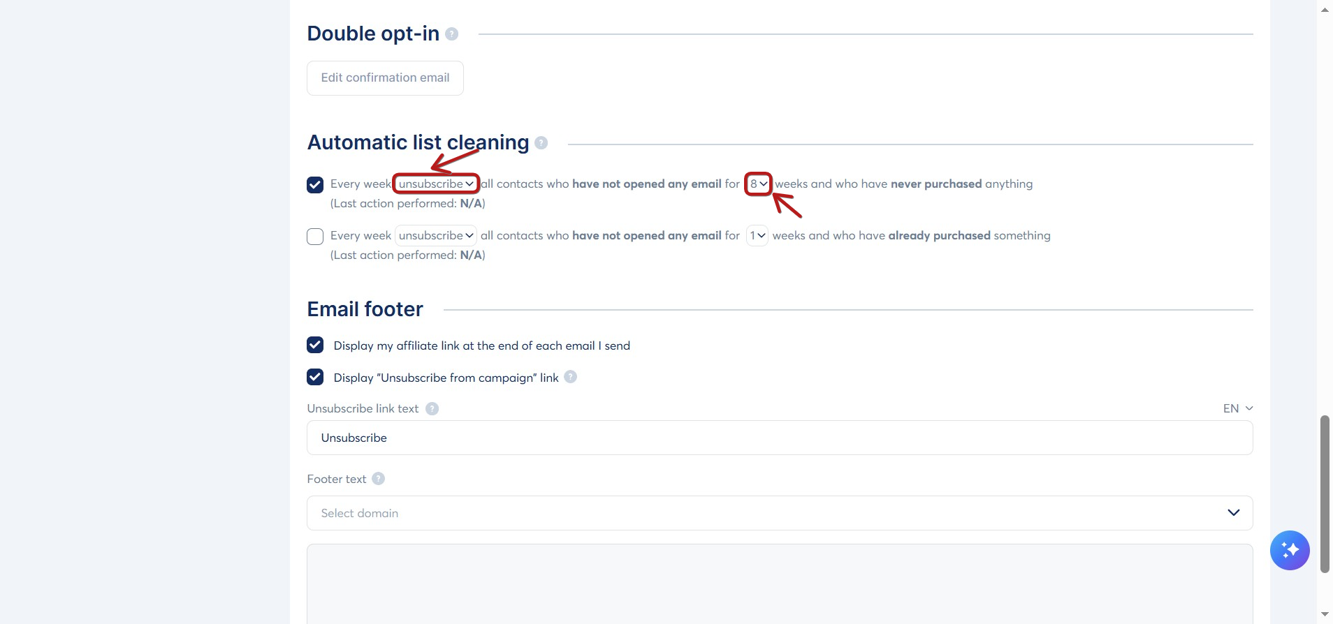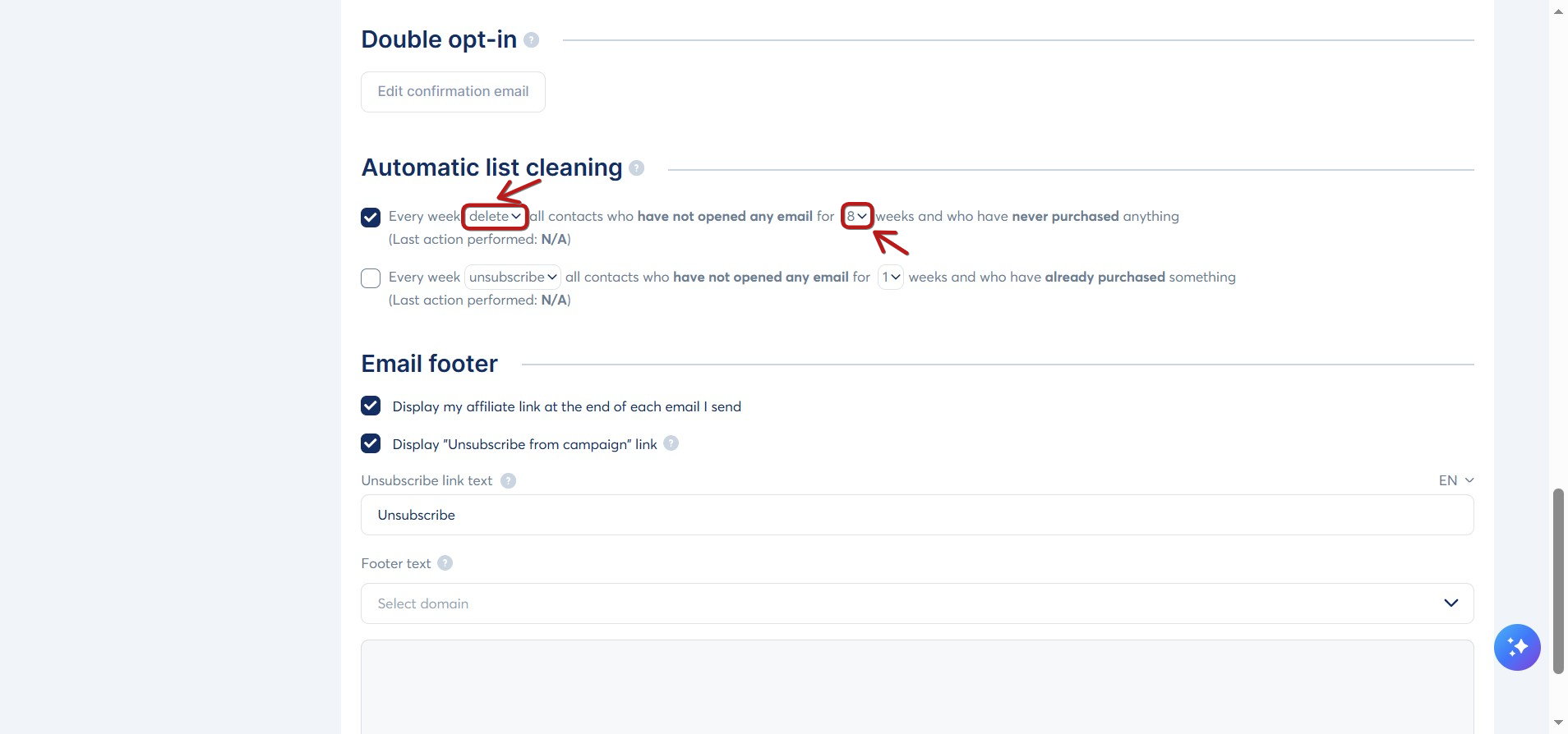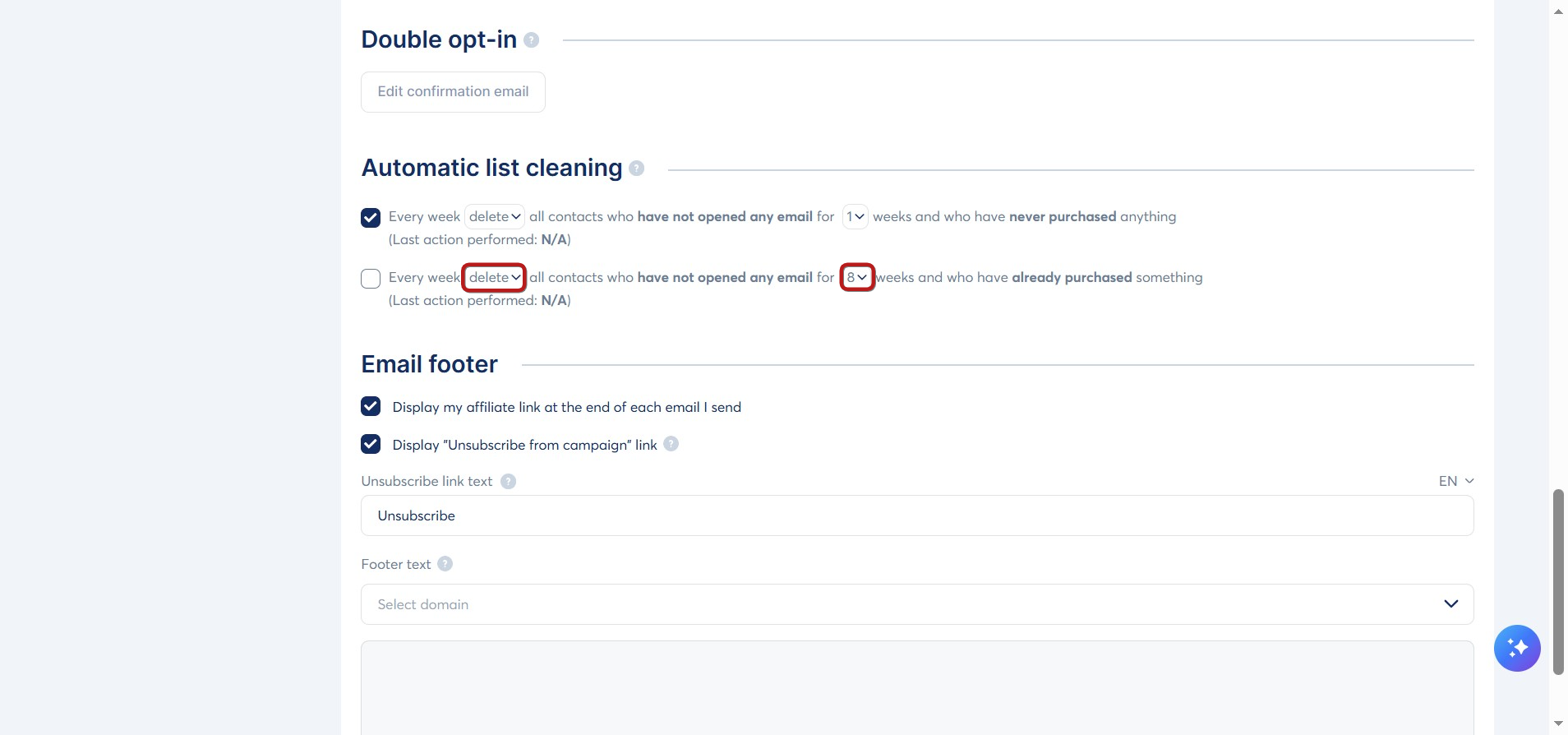 Επιλέξτε το πλαίσιο "Κάθε εβδομάδα διαγραφή όλων των επαφών που δεν έχουν ανοίξει κανένα email για 8 εβδομάδες και που έχουν ήδη αγοράσει κάτι".