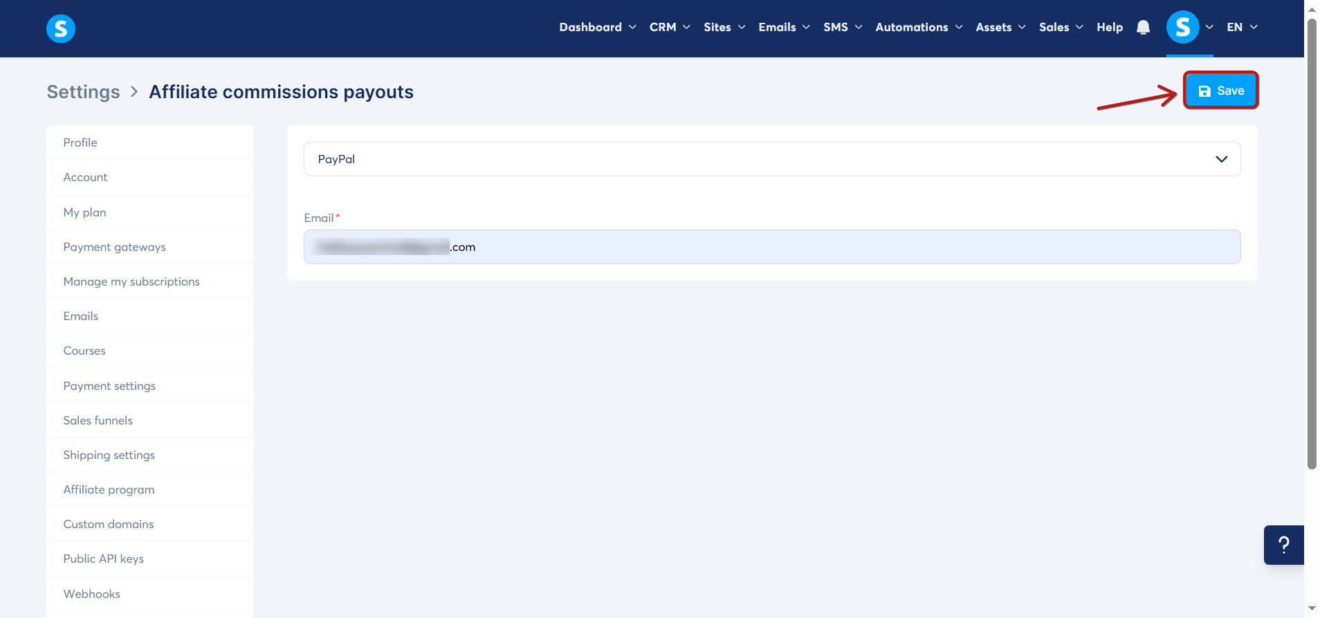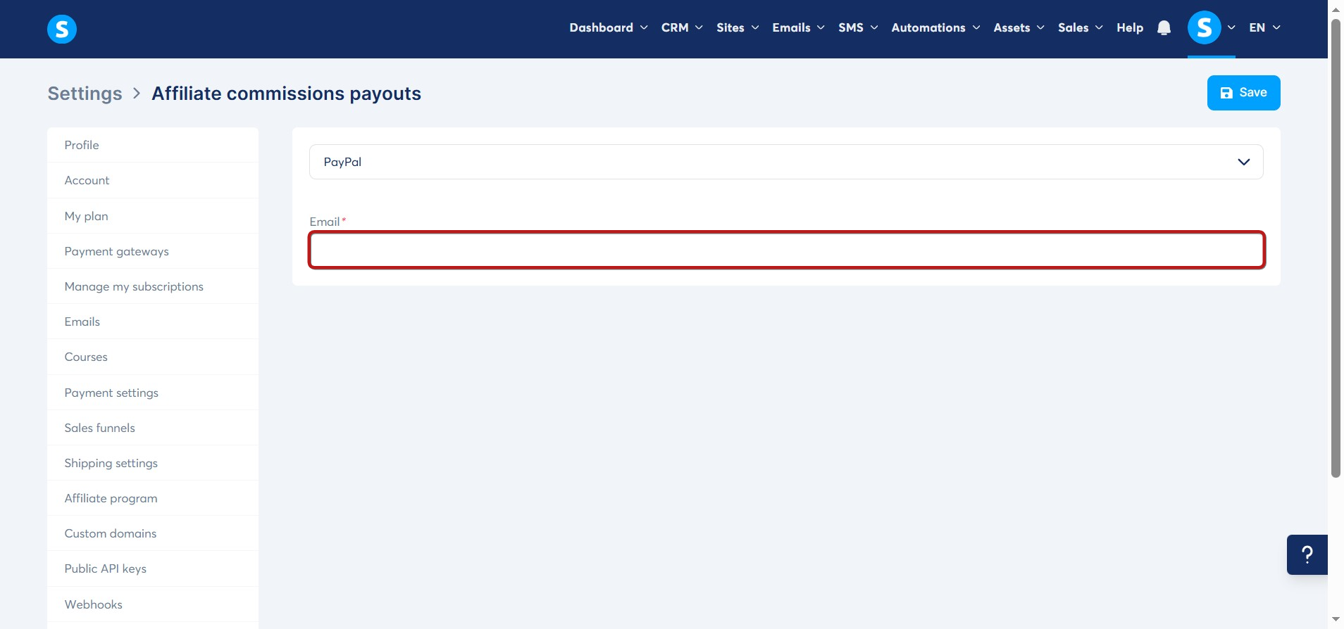 - PayPal: Εισαγάγετε τη διεύθυνση email που σχετίζεται με τον λογαριασμό σας PayPal και, στη συνέχεια, αποθηκεύστε τις ρυθμίσεις σας.