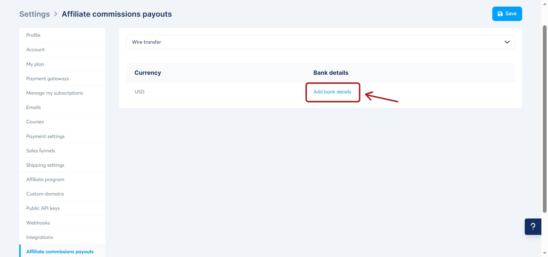 - Τραπεζικό έμβασμα: Για να προσθέσετε τραπεζικά στοιχεία, κάντε κλικ στο Add bank details.