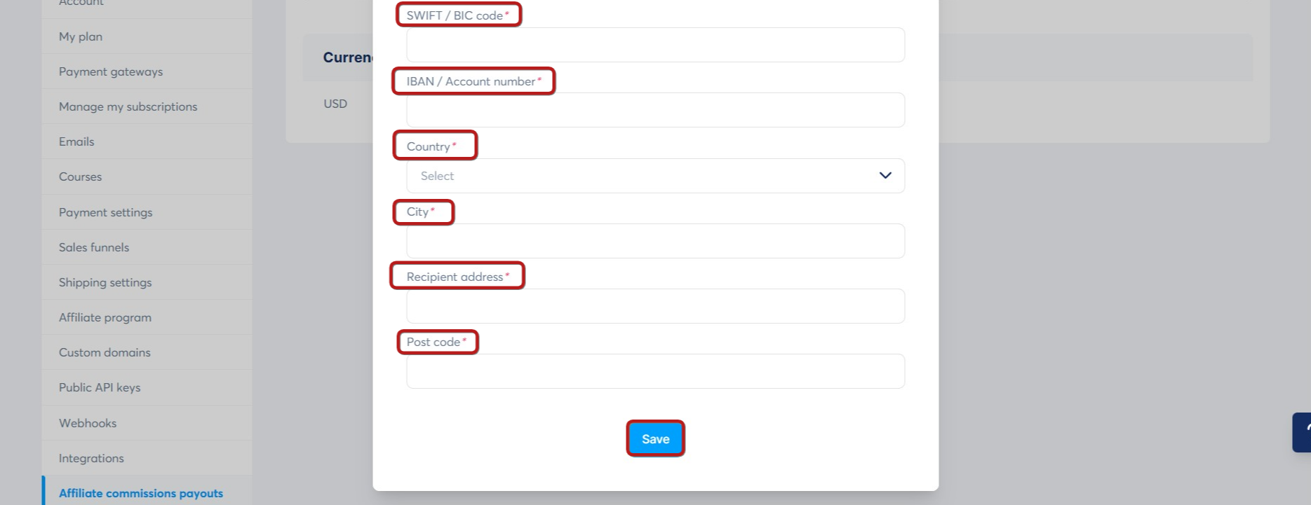 Εισαγάγετε τον τραπεζικό σας κωδικό (BIC/SWIFT), το IBAN, τη Χώρα (Country), την Πόλη (City), τη Διεύθυνση παραλήπτη (Recipient address) και τον Ταχυδρομικό κώδικα (Post code) και, στη συνέχεια, κάντε κλικ στο Save για να αποθηκεύσετε τα τραπεζικά σας στοιχεία.