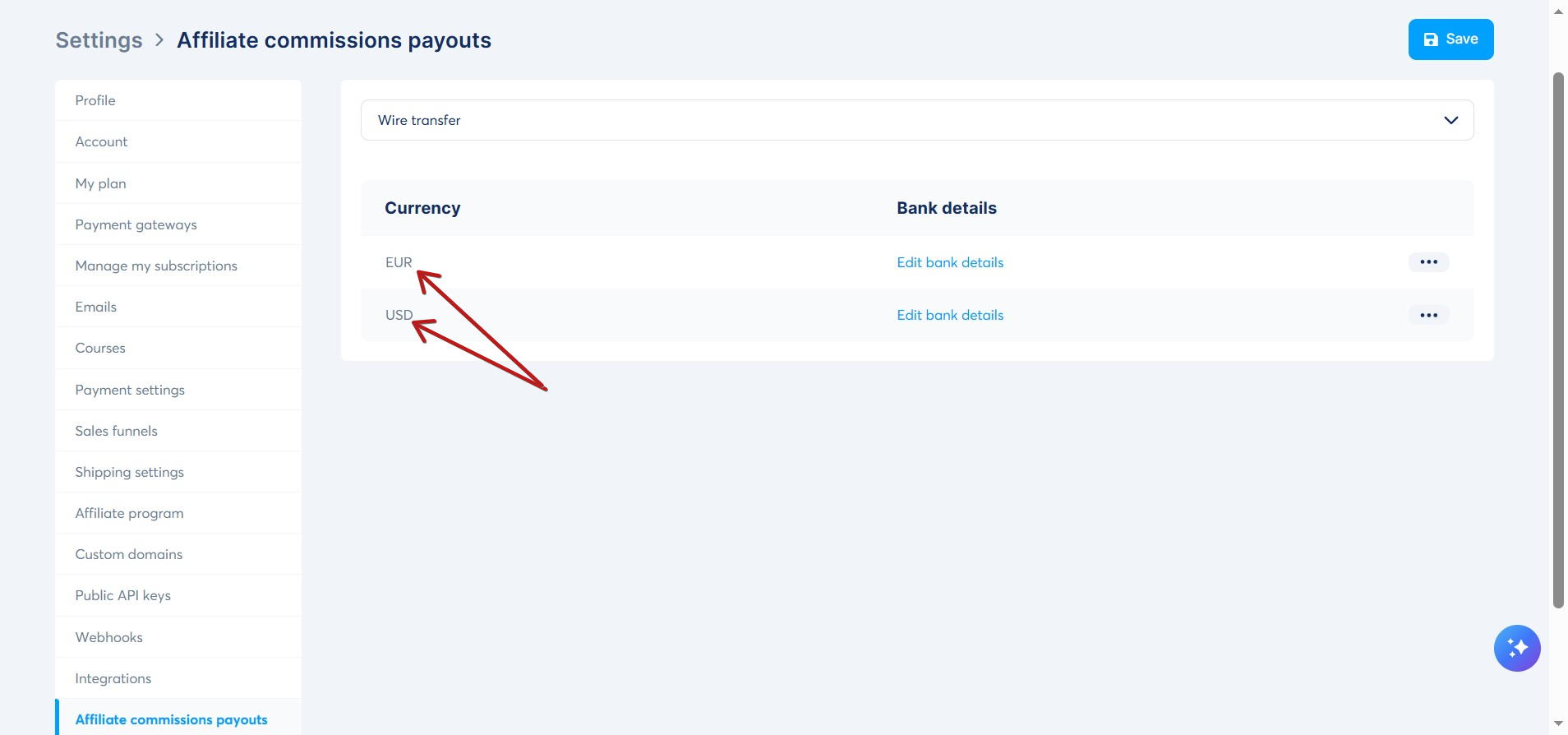 - Εάν επιθυμείτε να πληρώνεστε μέσω Τραπεζικό έμβασμα, πρέπει να ρυθμίσετε μια ξεχωριστή μέθοδο πληρωμής για κάθε νόμισμα στο οποίο έχετε κερδίσει προμήθειες. Ωστόσο, για το PayPal, μία μόνο διαμόρφωση καλύπτει όλα τα νομίσματα.